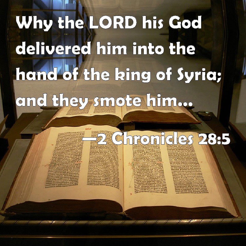 Choose a Background 2 Chronicles 28:5 Why the LORD his God delivered him into the hand of the king of Syria; and they smote him, and carried away a great multitude of them captives, and brought them to Damascus. And he was also delivered into the hand of the king of Israel, who smote him with a great slaughter. KJV: Wherefore the LORD his God delivered him into the hand of the king of Syria; and they smote him, and carried away a great multitude of them captives, and brought them to Damascus. And he was also delivered into the hand of the king of Israel, who smote him with a great slaughter. DRB: And the Lord his God delivered him into the hands of the king of Syria, who defeated him, and took a great booty out of his kingdom, and carried it to Damascus: he was also delivered into the hands of the king of Israel, who overthrew him with a great slaughter. DBT: Therefore Jehovah his God gave him into the hand of the king of Syria; and they smote him, and carried away a great multitude of them captives, and brought them to Damascus. And he was also given into the hand of the king of Israel, who smote him with a great slaughter. ERV: Wherefore the LORD his God delivered him into the hand of the king of Syria; and they smote him, and carried away of his a great multitude of captives, and brought them to Damascus. And he was also delivered into the hand of the king of Israel, who smote him with a great slaughter. WBT: Wherefore the LORD his God delivered him into the hand of the king of Syria; and they smote him, and carried away a great multitude of them captives, and brought them to Damascus. And he was also delivered into the hand of the king of Israel, who smote him with a great slaughter. WEB: Therefore Yahweh his God delivered him into the hand of the king of Syria; and they struck him, and carried away of his a great multitude of captives, and brought them to Damascus. He was also delivered into the hand of the king of Israel, who struck him with a great slaughter. YLT: And Jehovah his God giveth him into the hand of the king of Aram, and they smite him, and take captive from him a great captivity, and bring them in to Damascus, and also into the hand of the king of Israel he hath been given, and he smiteth him — a great smiting.Links 2 Chronicles 28:5 NIV • 2 Chronicles 28:5 NLT • 2 Chronicles 28:5 ESV • 2 Chronicles 28:5 NASB • 2 Chronicles 28:5 KJV • 2 Chronicles 28:5 Interlinear • 2 Chronicles 28:5 Commentaries • 2 Chronicles 28:5 Parallel Texts • 2 Chronicles 28:5 Bible Apps • 2 Chronicles 28:5 Parallel • Bible Hub |
