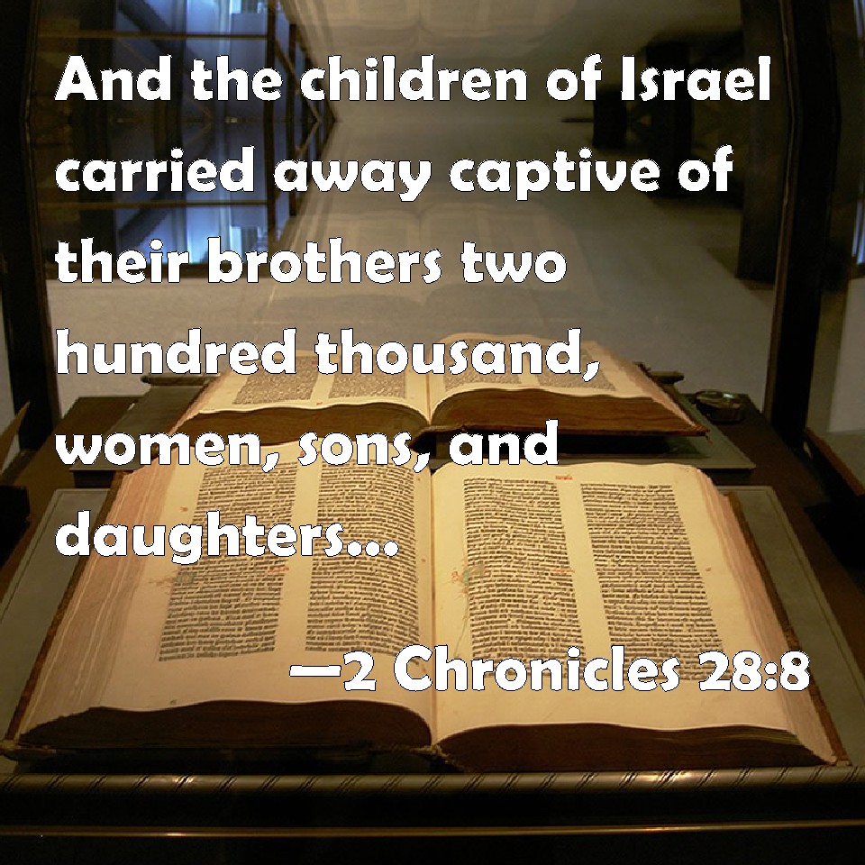 Choose a Background 2 Chronicles 28:8 And the children of Israel carried away captive of their brothers two hundred thousand, women, sons, and daughters, and took also away much spoil from them, and brought the spoil to Samaria. KJV: And the children of Israel carried away captive of their brethren two hundred thousand, women, sons, and daughters, and took also away much spoil from them, and brought the spoil to Samaria. DRB: And the children of Israel carried away of their brethren two hundred thousand women, boys, and girls, and an immense booty: and they brought it to Samaria. DBT: And the children of Israel carried away captive of their brethren two hundred thousand, women, sons, and daughters, and took away also much spoil from them, and brought the spoil to Samaria. ERV: And the children of Israel carried away captive of their brethren two hundred thousand, women, sons, and daughters, and took also away much spoil from them, and brought the spoil to Samaria. WBT: And the children of Israel carried away captive of their brethren two hundred thousand, women, sons, and daughters, and also took away much spoil from them, and brought the spoil to Samaria. WEB: The children of Israel carried away captive of their brothers two hundred thousand, women, sons, and daughters, and took also away much spoil from them, and brought the spoil to Samaria. YLT: And the sons of Israel take captive of their brethren, two hundred thousand, wives, sons and daughters, and also much spoil they have seized from them, and they bring in the spoil to Samaria.Links 2 Chronicles 28:8 NIV • 2 Chronicles 28:8 NLT • 2 Chronicles 28:8 ESV • 2 Chronicles 28:8 NASB • 2 Chronicles 28:8 KJV • 2 Chronicles 28:8 Interlinear • 2 Chronicles 28:8 Commentaries • 2 Chronicles 28:8 Parallel Texts • 2 Chronicles 28:8 Bible Apps • 2 Chronicles 28:8 Parallel • Bible Hub |