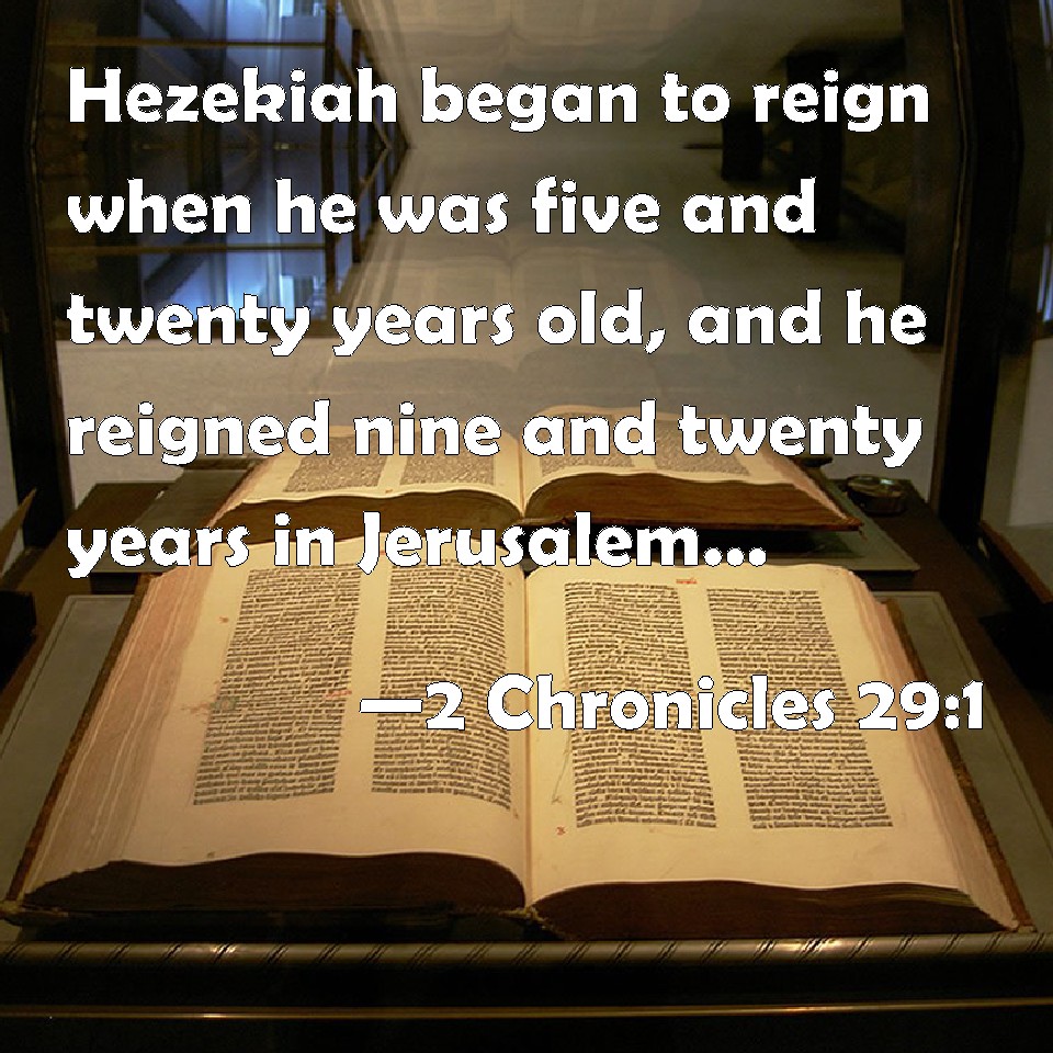 Choose a Background 2 Chronicles 29:1 Hezekiah began to reign when he was five and twenty years old, and he reigned nine and twenty years in Jerusalem. And his mother's name was Abijah, the daughter of Zechariah. KJV: Hezekiah began to reign when he was five and twenty years old, and he reigned nine and twenty years in Jerusalem. And his mother's name was Abijah, the daughter of Zechariah. DRB: Now Ezechias began to reign, when he was five and twenty years old, and he reigned nine and twenty years in Jerusalem: the name of his mother was Abia, the daughter of Zacharias. DBT: Hezekiah began to reign being twenty-five years old; and he reigned twenty-nine years in Jerusalem; and his mother's name was Abijah, daughter of Zechariah. ERV: Hezekiah began to reign when he was five and twenty years old; and he reigned nine and twenty years in Jerusalem: and his mother's name was Abijah the daughter of Zechariah. WBT: Hezekiah began to reign when he was five and twenty years old, and he reigned nine and twenty years in Jerusalem. And his mother's name was Abijah the daughter of Zechariah. WEB: Hezekiah began to reign when he was twenty-five years old; and he reigned twenty-nine years in Jerusalem: and his mother's name was Abijah, the daughter of Zechariah. YLT: Hezekiah hath reigned — a son of twenty and five years, and twenty and nine years he hath reigned in Jerusalem, and the name of his mother is Abijah daughter of Zechariah;Links 2 Chronicles 29:1 NIV • 2 Chronicles 29:1 NLT • 2 Chronicles 29:1 ESV • 2 Chronicles 29:1 NASB • 2 Chronicles 29:1 KJV • 2 Chronicles 29:1 Interlinear • 2 Chronicles 29:1 Commentaries • 2 Chronicles 29:1 Parallel Texts • 2 Chronicles 29:1 Bible Apps • 2 Chronicles 29:1 Parallel • Bible Hub |