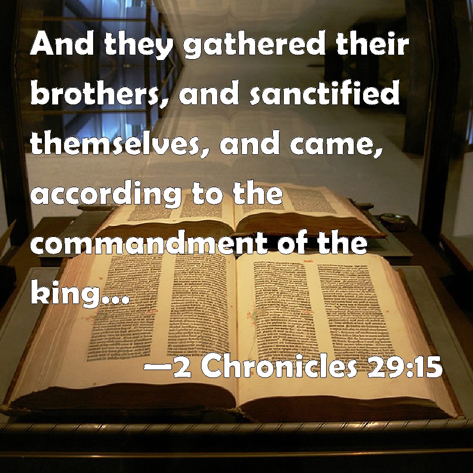 Choose a Background 2 Chronicles 29:15 And they gathered their brothers, and sanctified themselves, and came, according to the commandment of the king, by the words of the LORD, to cleanse the house of the LORD. KJV: And they gathered their brethren, and sanctified themselves, and came, according to the commandment of the king, by the words of the LORD, to cleanse the house of the LORD. DRB: And they gathered together their brethren, and sanctified themselves, and went in according to the commandment of the king, and the precept of the Lord, to purify the house of God. DBT: And they gathered their brethren, and hallowed themselves, and came, according to the commandment of the king by the words of Jehovah, to cleanse the house of Jehovah. ERV: And they gathered their brethren, and sanctified themselves, and went in, according to the commandment of the king by the words of the LORD, to cleanse the house of the LORD. WBT: And they assembled their brethren, and sanctified themselves, and came, according to the commandment of the king, by the words of the LORD, to cleanse the house of the LORD. WEB: They gathered their brothers, and sanctified themselves, and went in, according to the commandment of the king by the words of Yahweh, to cleanse the house of Yahweh. YLT: and they gather their brethren, and sanctify themselves, and come in, according to the command of the king in the matters of Jehovah, to cleanse the house of Jehovah,Links 2 Chronicles 29:15 NIV • 2 Chronicles 29:15 NLT • 2 Chronicles 29:15 ESV • 2 Chronicles 29:15 NASB • 2 Chronicles 29:15 KJV • 2 Chronicles 29:15 Interlinear • 2 Chronicles 29:15 Commentaries • 2 Chronicles 29:15 Parallel Texts • 2 Chronicles 29:15 Bible Apps • 2 Chronicles 29:15 Parallel • Bible Hub |