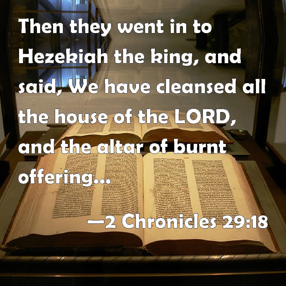 Choose a Background 2 Chronicles 29:18 Then they went in to Hezekiah the king, and said, We have cleansed all the house of the LORD, and the altar of burnt offering, with all the vessels thereof, and the show bread table, with all the vessels thereof. KJV: Then they went in to Hezekiah the king, and said, We have cleansed all the house of the LORD, and the altar of burnt offering, with all the vessels thereof, and the shewbread table, with all the vessels thereof. DRB: And they went is to king Ezechias, and said to him: We have sanctified all the house of the Lord, and the altar of holocaust, and the vessels thereof, and the table of proposition with all its vessels, DBT: And they went in to king Hezekiah, and said, We have cleansed all the house of Jehovah, and the altar of burnt-offering with all its vessels, and the table of the bread to be set in rows, and all its vessels; ERV: Then they went in to Hezekiah the king within the palace, and said, We have cleansed all the house of the LORD, and the altar of burnt offering, with all the vessels thereof, and the table of shewbread, with all the vessels thereof. WBT: Then they went in to Hezekiah the king, and said, We have cleansed all the house of the LORD, and the altar of burnt-offering, with all its vessels, and the show-bread table, with all its vessels. WEB: Then they went in to Hezekiah the king within [the palace], and said, "We have cleansed all the house of Yahweh, and the altar of burnt offering, with all its vessels, and the table of show bread, with all its vessels. YLT: And they come in within unto Hezekiah the king, and say, 'We have cleansed all the house of Jehovah, and the altar of the burnt-offering, and all its vessels, and the table of the arrangement, and all its vessels,Links 2 Chronicles 29:18 NIV • 2 Chronicles 29:18 NLT • 2 Chronicles 29:18 ESV • 2 Chronicles 29:18 NASB • 2 Chronicles 29:18 KJV • 2 Chronicles 29:18 Interlinear • 2 Chronicles 29:18 Commentaries • 2 Chronicles 29:18 Parallel Texts • 2 Chronicles 29:18 Bible Apps • 2 Chronicles 29:18 Parallel • Bible Hub |