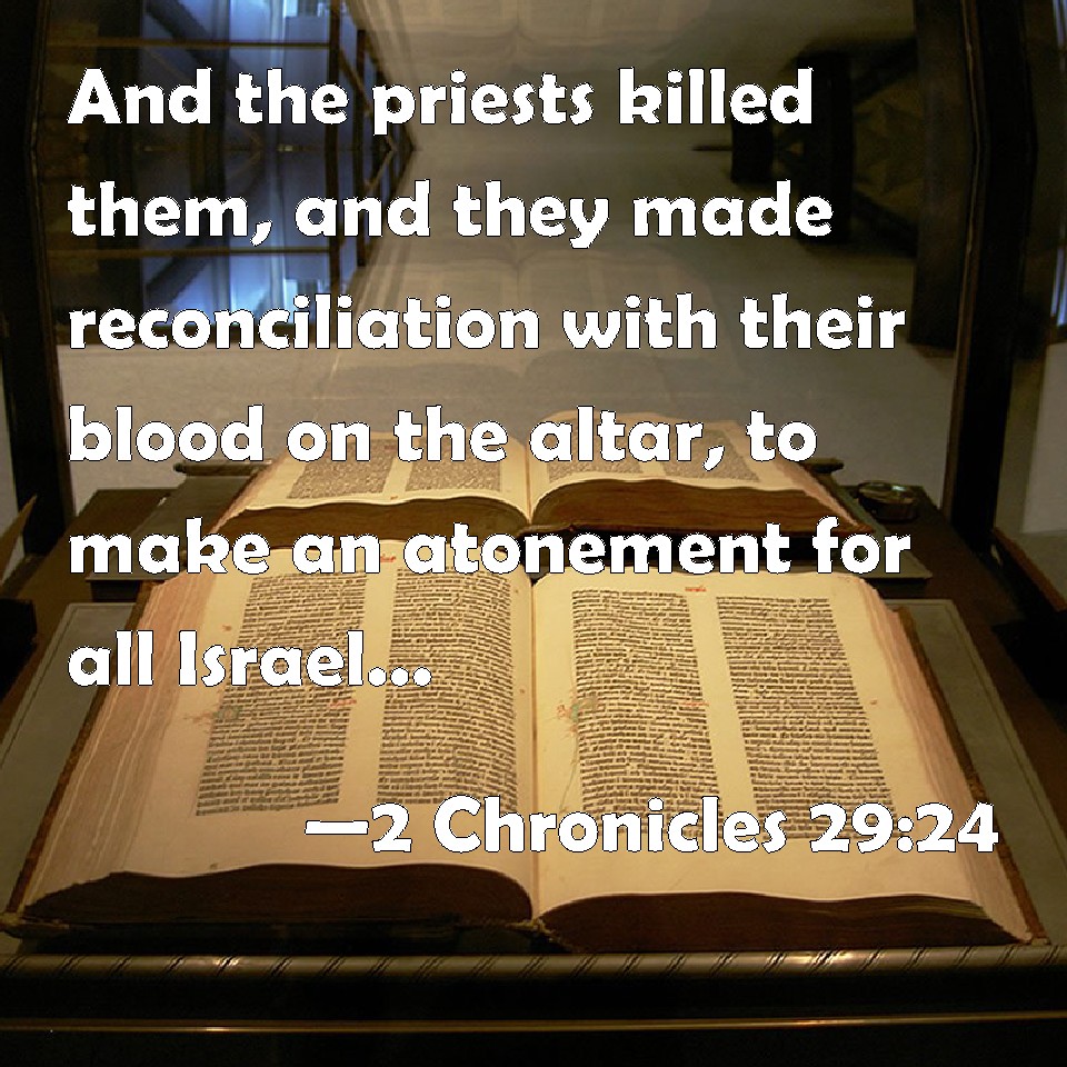 Choose a Background 2 Chronicles 29:24 And the priests killed them, and they made reconciliation with their blood on the altar, to make an atonement for all Israel: for the king commanded that the burnt offering and the sin offering should be made for all Israel. KJV: And the priests killed them, and they made reconciliation with their blood upon the altar, to make an atonement for all Israel: for the king commanded that the burnt offering and the sin offering should be made for all Israel. DRB: And the priests immolated them, and sprinkled their blood before the altar for an expiation of all Israel: for the king had commanded that the holocaust and the sin offering should be made for all Israel. DBT: And the priests slaughtered them, and they made purification for sin with their blood upon the altar, to make an atonement for all Israel; because for all Israel, said the king, is the burnt-offering and the sin-offering. ERV: and the priests killed them, and they made a sin offering with their blood upon the altar, to make atonement for all Israel: for the king commanded that the burnt offering and the sin offering should be made for all Israel. WBT: And the priests killed them, and they made reconciliation with their blood upon the altar, to make an atonement for all Israel: for the king commanded that the burnt-offering and the sin-offering should be made for all Israel. WEB: and the priests killed them, and they made a sin offering with their blood on the altar, to make atonement for all Israel; for the king commanded [that] the burnt offering and the sin offering [should be made] for all Israel. YLT: and the priests slaughter them, and make a sin-offering with their blood on the altar, to make atonement for all Israel, for 'For all Israel,' said the king, 'is the burnt-offering and the sin-offering.'Links 2 Chronicles 29:24 NIV • 2 Chronicles 29:24 NLT • 2 Chronicles 29:24 ESV • 2 Chronicles 29:24 NASB • 2 Chronicles 29:24 KJV • 2 Chronicles 29:24 Interlinear • 2 Chronicles 29:24 Commentaries • 2 Chronicles 29:24 Parallel Texts • 2 Chronicles 29:24 Bible Apps • 2 Chronicles 29:24 Parallel • Bible Hub |
