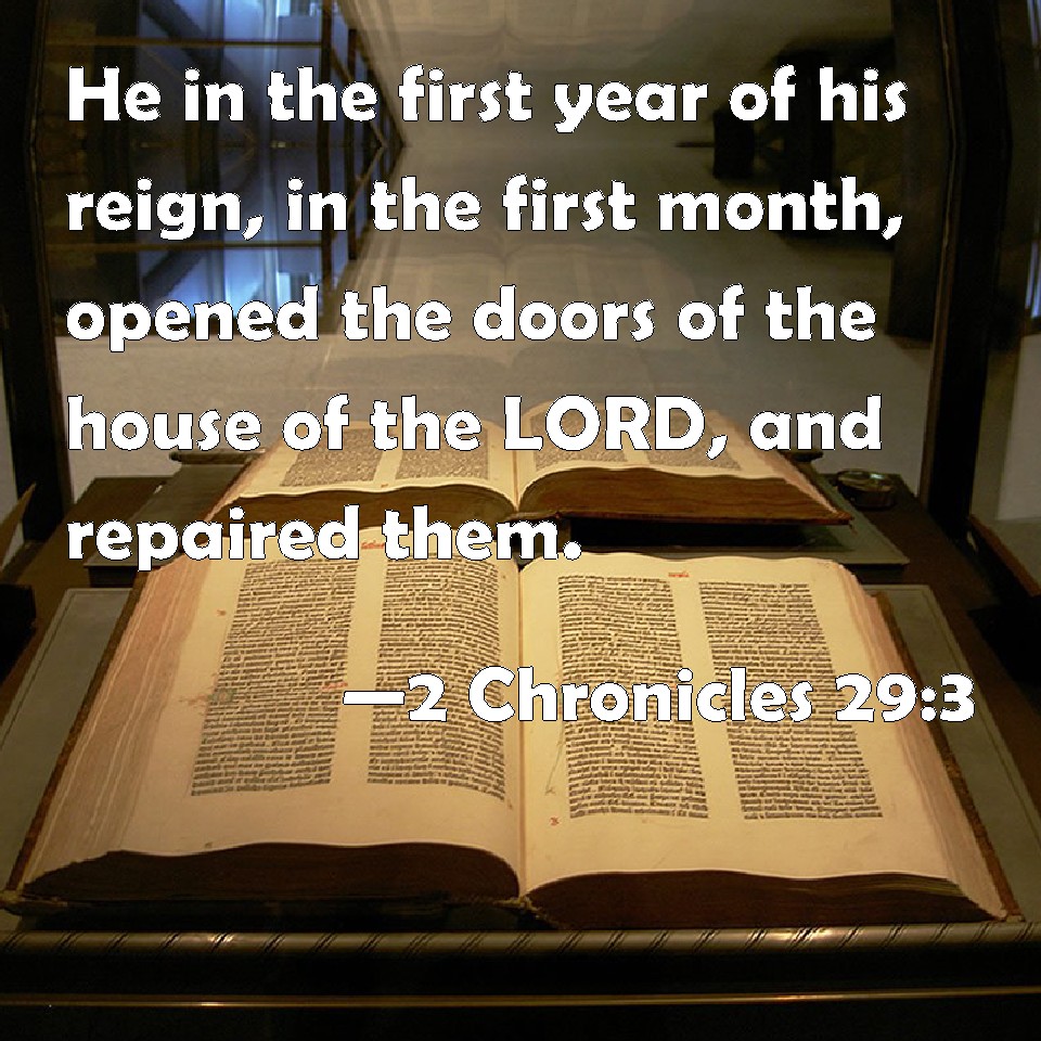 Choose a Background 2 Chronicles 29:3 He in the first year of his reign, in the first month, opened the doors of the house of the LORD, and repaired them. KJV: He in the first year of his reign, in the first month, opened the doors of the house of the LORD, and repaired them. DRB: In the first year and month of his reign he opened the doors of the house of the Lord, and repaired them. DBT: He, in the first year of his reign, in the first month, opened the doors of the house of Jehovah, and repaired them. ERV: He in the first year of his reign, in the first month, opened the door of the house of the LORD, and repaired them. WBT: He, in the first year of his reign, in the first month, opened the doors of the house of the LORD, and repaired them. WEB: He in the first year of his reign, in the first month, opened the doors of the house of Yahweh, and repaired them. YLT: He, in the first year of his reign, in the first month, hath opened the doors of the house of Jehovah, and strengtheneth them,Links 2 Chronicles 29:3 NIV • 2 Chronicles 29:3 NLT • 2 Chronicles 29:3 ESV • 2 Chronicles 29:3 NASB • 2 Chronicles 29:3 KJV • 2 Chronicles 29:3 Interlinear • 2 Chronicles 29:3 Commentaries • 2 Chronicles 29:3 Parallel Texts • 2 Chronicles 29:3 Bible Apps • 2 Chronicles 29:3 Parallel • Bible Hub |