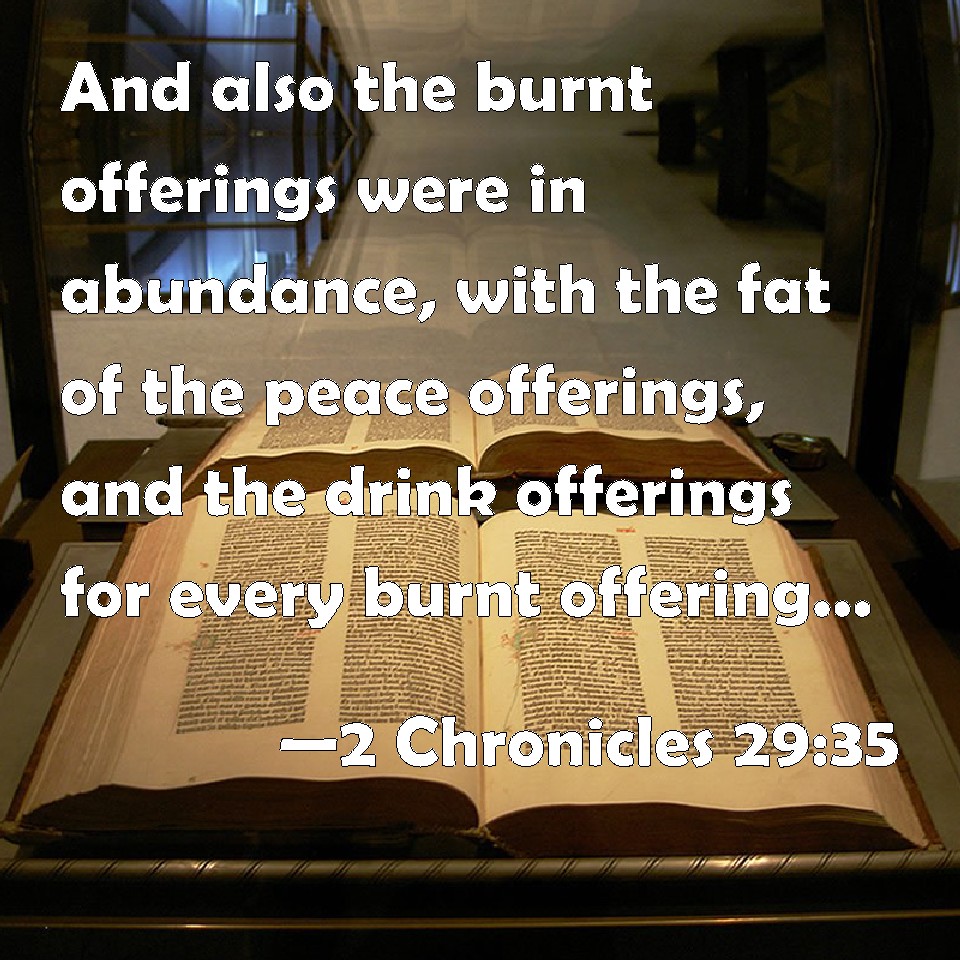Choose a Background 2 Chronicles 29:35 And also the burnt offerings were in abundance, with the fat of the peace offerings, and the drink offerings for every burnt offering. So the service of the house of the LORD was set in order. KJV: And also the burnt offerings were in abundance, with the fat of the peace offerings, and the drink offerings for every burnt offering. So the service of the house of the LORD was set in order. DRB: So there were many holocausts, and the fat of peace offerings, and the libations of holocausts: and the service of the house of the Lord was completed. DBT: And also the burnt-offerings were in abundance, with the fat of the peace-offerings, and with the drink-offerings for the burnt-offering. And the service of the house of Jehovah was set in order. ERV: And also the burnt offerings were in abundance, with the fat of the peace offerings, and with the drink offerings for every burnt offering. So the service of the house of the LORD was set in order. WBT: And also the burnt-offerings were in abundance, with the fat of the peace-offerings, and the drink-offerings for every burnt-offering. So the service of the house of the LORD was set in order. WEB: Also the burnt offerings were in abundance, with the fat of the peace offerings, and with the drink offerings for every burnt offering. So the service of the house of Yahweh was set in order. YLT: And also, burnt-offerings are in abundance, with fat of the peace-offerings, and with oblations for the burnt-offering; and the service of the house of Jehovah is established,Links 2 Chronicles 29:35 NIV • 2 Chronicles 29:35 NLT • 2 Chronicles 29:35 ESV • 2 Chronicles 29:35 NASB • 2 Chronicles 29:35 KJV • 2 Chronicles 29:35 Interlinear • 2 Chronicles 29:35 Commentaries • 2 Chronicles 29:35 Parallel Texts • 2 Chronicles 29:35 Bible Apps • 2 Chronicles 29:35 Parallel • Bible Hub |