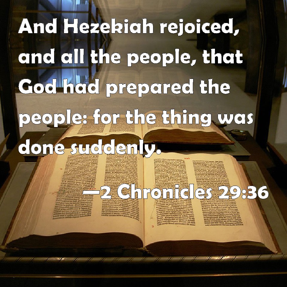 Choose a Background 2 Chronicles 29:36 And Hezekiah rejoiced, and all the people, that God had prepared the people: for the thing was done suddenly. KJV: And Hezekiah rejoiced, and all the people, that God had prepared the people: for the thing was done suddenly. DRB: And Ezechias, and all the people rejoiced because the ministry of the Lord was accomplished. For the resolution of doing this thing was taken suddenly. DBT: And Hezekiah rejoiced, and all the people, that God had prepared the people; for the thing was done suddenly. ERV: And Hezekiah rejoiced, and all the people, because of that which God had prepared for the people: for the thing was done suddenly. WBT: And Hezekiah rejoiced, and all the people, that God had prepared the people: for the thing was done suddenly. WEB: Hezekiah rejoiced, and all the people, because of that which God had prepared for the people: for the thing was done suddenly. YLT: and rejoice doth Hezekiah and all the people, because of God's giving preparation to the people, for the thing hath been suddenly.Links 2 Chronicles 29:36 NIV • 2 Chronicles 29:36 NLT • 2 Chronicles 29:36 ESV • 2 Chronicles 29:36 NASB • 2 Chronicles 29:36 KJV • 2 Chronicles 29:36 Interlinear • 2 Chronicles 29:36 Commentaries • 2 Chronicles 29:36 Parallel Texts • 2 Chronicles 29:36 Bible Apps • 2 Chronicles 29:36 Parallel • Bible Hub |