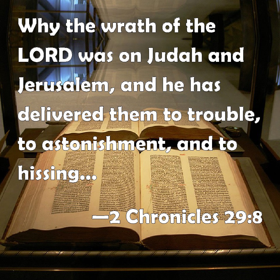 Choose a Background 2 Chronicles 29:8 Why the wrath of the LORD was on Judah and Jerusalem, and he has delivered them to trouble, to astonishment, and to hissing, as you see with your eyes. KJV: Wherefore the wrath of the LORD was upon Judah and Jerusalem, and he hath delivered them to trouble, to astonishment, and to hissing, as ye see with your eyes. DRB: Therefore the wrath of the Lord hath been stirred up against Juda and Jerusalem, and he hath delivered them to trouble, and to destruction, and to be hissed at, as you see with your eyes. DBT: Therefore the wrath of Jehovah has been upon Judah and Jerusalem, and he has delivered them to vexation, to desolation, and to hissing, as ye see with your eyes. ERV: Wherefore the wrath of the LORD was upon Judah and Jerusalem, and he hath delivered them to be tossed to and fro, to be an astonishment, and an hissing, as ye see with your eyes. WBT: Wherefore the wrath of the LORD hath been upon Judah and Jerusalem, and he hath delivered them to trouble, to astonishment, and to hissing, as ye see with your eyes. WEB: Therefore the wrath of Yahweh was on Judah and Jerusalem, and he has delivered them to be tossed back and forth, to be an astonishment, and a hissing, as you see with your eyes. YLT: and the wrath of Jehovah is on Judah and Jerusalem, and He giveth them for a trembling, for an astonishment, and for a hissing, as ye are seeing with your eyes.Links 2 Chronicles 29:8 NIV • 2 Chronicles 29:8 NLT • 2 Chronicles 29:8 ESV • 2 Chronicles 29:8 NASB • 2 Chronicles 29:8 KJV • 2 Chronicles 29:8 Interlinear • 2 Chronicles 29:8 Commentaries • 2 Chronicles 29:8 Parallel Texts • 2 Chronicles 29:8 Bible Apps • 2 Chronicles 29:8 Parallel • Bible Hub |