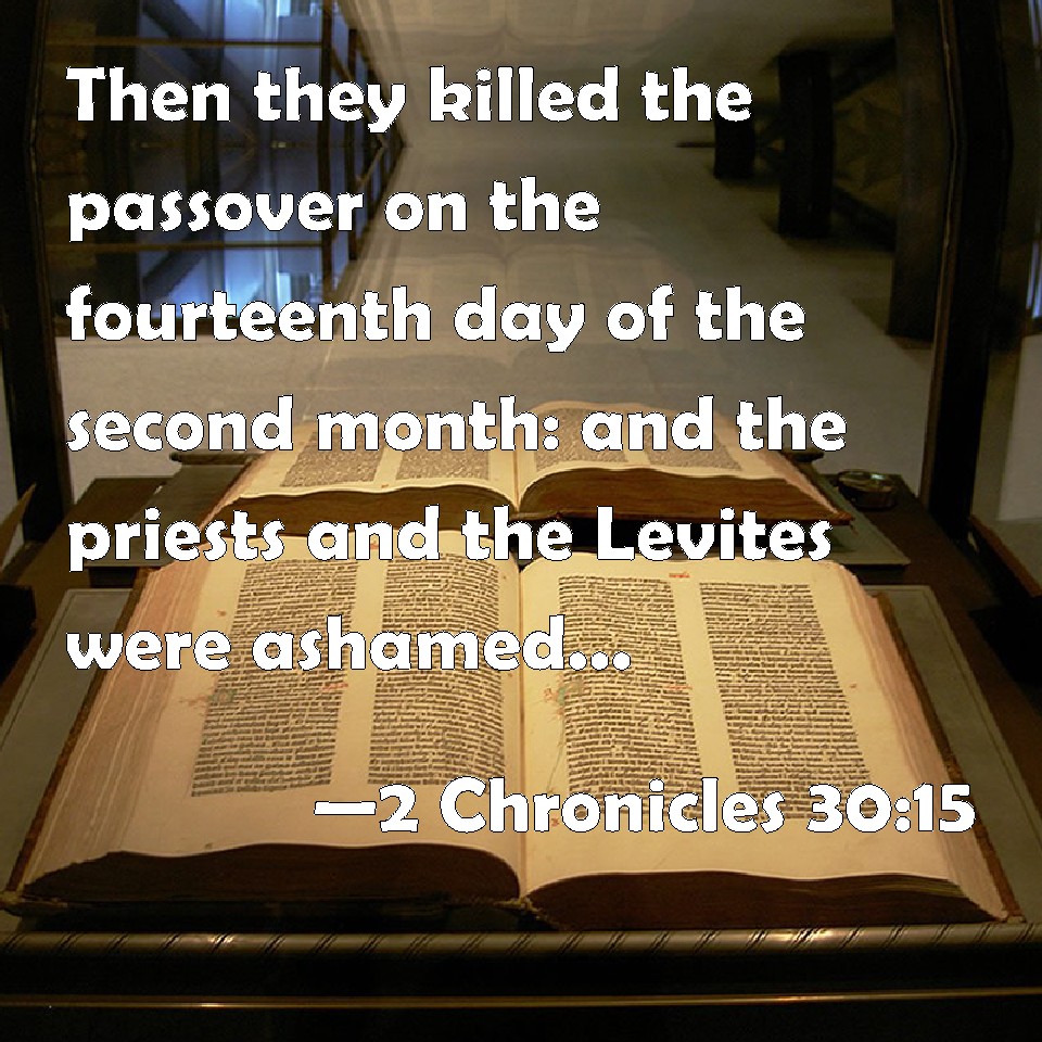 Choose a Background 2 Chronicles 30:15 Then they killed the passover on the fourteenth day of the second month: and the priests and the Levites were ashamed, and sanctified themselves, and brought in the burnt offerings into the house of the LORD. KJV: Then they killed the passover on the fourteenth day of the second month: and the priests and the Levites were ashamed, and sanctified themselves, and brought in the burnt offerings into the house of the LORD. DRB: And they immolated the phase on the fourteenth day of the second month. And the priests and the Levites being at length sanctified offered holocausts in the house of the Lord. DBT: And they slaughtered the passover on the fourteenth of the second month; and the priests and the Levites were ashamed, and hallowed themselves; and they brought the burnt-offerings into the house of Jehovah. ERV: Then they killed the passover on the fourteenth day of the second month: and the priests and the Levites were ashamed, and sanctified themselves, and brought burnt offerings into the house of the LORD. WBT: Then they killed the passover on the fourteenth day of the second month: and the priests and the Levites were ashamed, and sanctified themselves, and brought in the burnt-offerings into the house of the LORD. WEB: Then they killed the Passover on the fourteenth [day] of the second month: and the priests and the Levites were ashamed, and sanctified themselves, and brought burnt offerings into the house of Yahweh. YLT: and they slaughter the passover-offering on the fourteenth of the second month, and the priests and the Levites have been ashamed, and sanctify themselves, and bring in burnt-offerings to the house of Jehovah.Links 2 Chronicles 30:15 NIV • 2 Chronicles 30:15 NLT • 2 Chronicles 30:15 ESV • 2 Chronicles 30:15 NASB • 2 Chronicles 30:15 KJV • 2 Chronicles 30:15 Interlinear • 2 Chronicles 30:15 Commentaries • 2 Chronicles 30:15 Parallel Texts • 2 Chronicles 30:15 Bible Apps • 2 Chronicles 30:15 Parallel • Bible Hub |