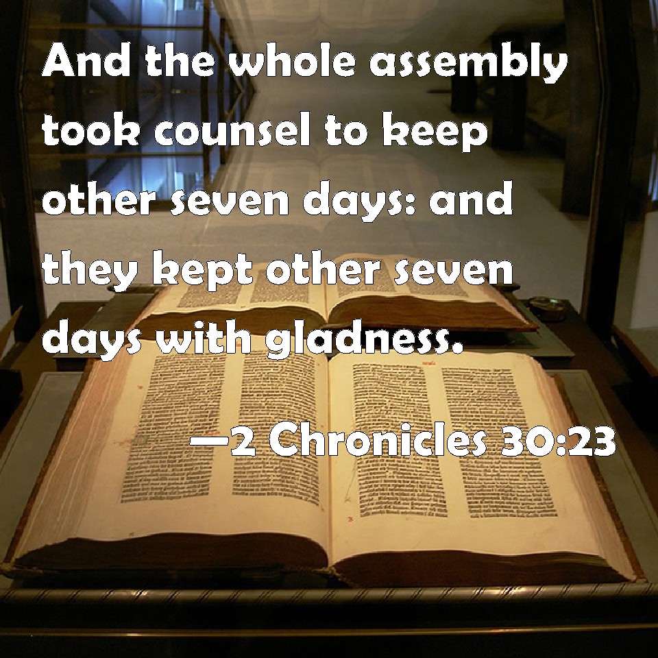 2 Chronicles 30:23 And the whole assembly took counsel to keep other seven days: and they kept other seven days with gladness.