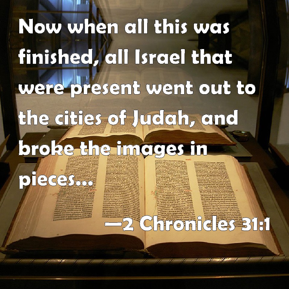 Choose a Background 2 Chronicles 31:1 Now when all this was finished, all Israel that were present went out to the cities of Judah, and broke the images in pieces, and cut down the groves, and threw down the high places and the altars out of all Judah and Benjamin, in Ephraim also and Manasseh, until they had utterly destroyed them all. Then all the children of Israel returned, every man to his possession, into their own cities. KJV: Now when all this was finished, all Israel that were present went out to the cities of Judah, and brake the images in pieces, and cut down the groves, and threw down the high places and the altars out of all Judah and Benjamin, in Ephraim also and Manasseh, until they had utterly destroyed them all. Then all the children of Israel returned, every man to his possession, into their own cities. DRB: And when these things had been duly celebrated, all Israel that were found in the cities of Juda, went out, and they broke the idols, and cut down the groves. demolished the high places, and destroyed the altars, not only out of all Juda and Benjamin, but out of Ephraim also and Manasses, till they had utterly destroyed them: then all the children of Israel returned to their possessions and cities. DBT: And when all this was finished, all Israel that were present went out to the cities of Judah, and broke the columns, and hewed down the Asherahs, and demolished the high places and the altars in all Judah and Benjamin, in Ephraim also and Manasseh, until they had destroyed them all. And all the children of Israel returned every man to his possession, into their cities. ERV: Now when all this was finished, all Israel that were present went out to the cities of Judah, and brake in pieces the pillars, and hewed down the Asherim, and brake down the high places and the altars out of all Judah and Benjamin, in Ephraim also and Manasseh, until they had destroyed them all. Then all the children of Israel returned, every man to his possession, into their own cities. WBT: Now when all this was finished, all Israel that were present went out to the cities of Judah, and broke the images in pieces, and cut down the groves, and threw down the high places and the altars out of all Judah and Benjamin, in Ephraim also and Manasseh, until they had utterly destroyed them all. Then all the children of Israel returned every man to his possession into their own cities. WEB: Now when all this was finished, all Israel who were present went out to the cities of Judah, and broke in pieces the pillars, and cut down the Asherim, and broke down the high places and the altars out of all Judah and Benjamin, in Ephraim also and Manasseh, until they had destroyed them all. Then all the children of Israel returned, every man to his possession, into their own cities. YLT: And at the completion of all this, gone out have all Israel who are found present to the cities of Judah, and break the standing-pillars, and cut down the shrines, and break down the high places and the altars, out of all Judah and Benjamin, and in Ephraim and Manasseh, even to completion, and all the sons of Israel turn back, each to his Possession, to their cities.Links 2 Chronicles 31:1 NIV • 2 Chronicles 31:1 NLT • 2 Chronicles 31:1 ESV • 2 Chronicles 31:1 NASB • 2 Chronicles 31:1 KJV • 2 Chronicles 31:1 Interlinear • 2 Chronicles 31:1 Commentaries • 2 Chronicles 31:1 Parallel Texts • 2 Chronicles 31:1 Bible Apps • 2 Chronicles 31:1 Parallel • Bible Hub |