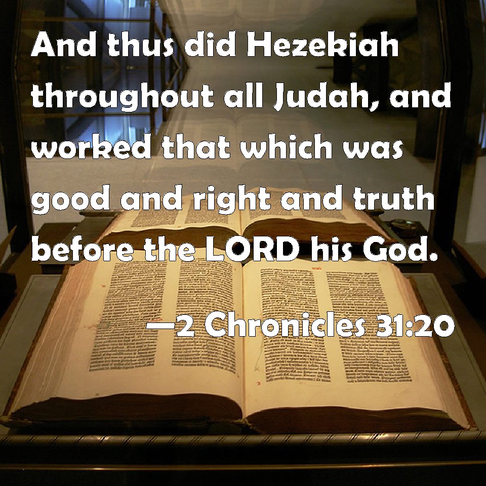 Choose a Background 2 Chronicles 31:20 And thus did Hezekiah throughout all Judah, and worked that which was good and right and truth before the LORD his God. KJV: And thus did Hezekiah throughout all Judah, and wrought that which was good and right and truth before the LORD his God. DRB: So Ezechias did all things, which we have said in all Juda, and wrought that which was good; and right, and truth, before the Lord his God, DBT: And thus did Hezekiah throughout Judah, and wrought what was good and right and true before Jehovah his God. ERV: And thus did Hezekiah throughout all Judah; and he wrought that which was good and right and faithful before the LORD his God. WBT: And thus did Hezekiah throughout all Judah, and performed that which was good and right and truth before the LORD his God. WEB: Hezekiah did so throughout all Judah; and he worked that which was good and right and faithful before Yahweh his God. YLT: And Hezekiah doth thus in all Judah, and doth that which is good, and that which is right, and that which is true, before Jehovah his God;Links 2 Chronicles 31:20 NIV • 2 Chronicles 31:20 NLT • 2 Chronicles 31:20 ESV • 2 Chronicles 31:20 NASB • 2 Chronicles 31:20 KJV • 2 Chronicles 31:20 Interlinear • 2 Chronicles 31:20 Commentaries • 2 Chronicles 31:20 Parallel Texts • 2 Chronicles 31:20 Bible Apps • 2 Chronicles 31:20 Parallel • Bible Hub |