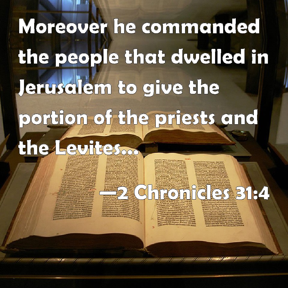 Choose a Background 2 Chronicles 31:4 Moreover he commanded the people that dwelled in Jerusalem to give the portion of the priests and the Levites, that they might be encouraged in the law of the LORD. KJV: Moreover he commanded the people that dwelt in Jerusalem to give the portion of the priests and the Levites, that they might be encouraged in the law of the LORD. DRB: He commanded also the people that dwelt in Jerusalem, to give to the priests, and the Levites their portion, that they might attend to the law of the Lord. DBT: And he commanded the people that dwelt in Jerusalem to give the portion of the priests and the Levites, that they might be encouraged in the law of Jehovah. ERV: Moreover he commanded the people that dwelt in Jerusalem to give the portion of the priests and the Levites, that they might give themselves to the law of the LORD. WBT: Moreover, he commanded the people that dwelt in Jerusalem to give the portion of the priests and the Levites, that they might be encouraged in the law of the LORD. WEB: Moreover he commanded the people who lived in Jerusalem to give the portion of the priests and the Levites, that they might give themselves to the law of Yahweh. YLT: And he saith to the people, to the inhabitants of Jerusalem, to give the portion of the priests, and of the Levites, so that they are strengthened in the law of Jehovah;Links 2 Chronicles 31:4 NIV • 2 Chronicles 31:4 NLT • 2 Chronicles 31:4 ESV • 2 Chronicles 31:4 NASB • 2 Chronicles 31:4 KJV • 2 Chronicles 31:4 Interlinear • 2 Chronicles 31:4 Commentaries • 2 Chronicles 31:4 Parallel Texts • 2 Chronicles 31:4 Bible Apps • 2 Chronicles 31:4 Parallel • Bible Hub |