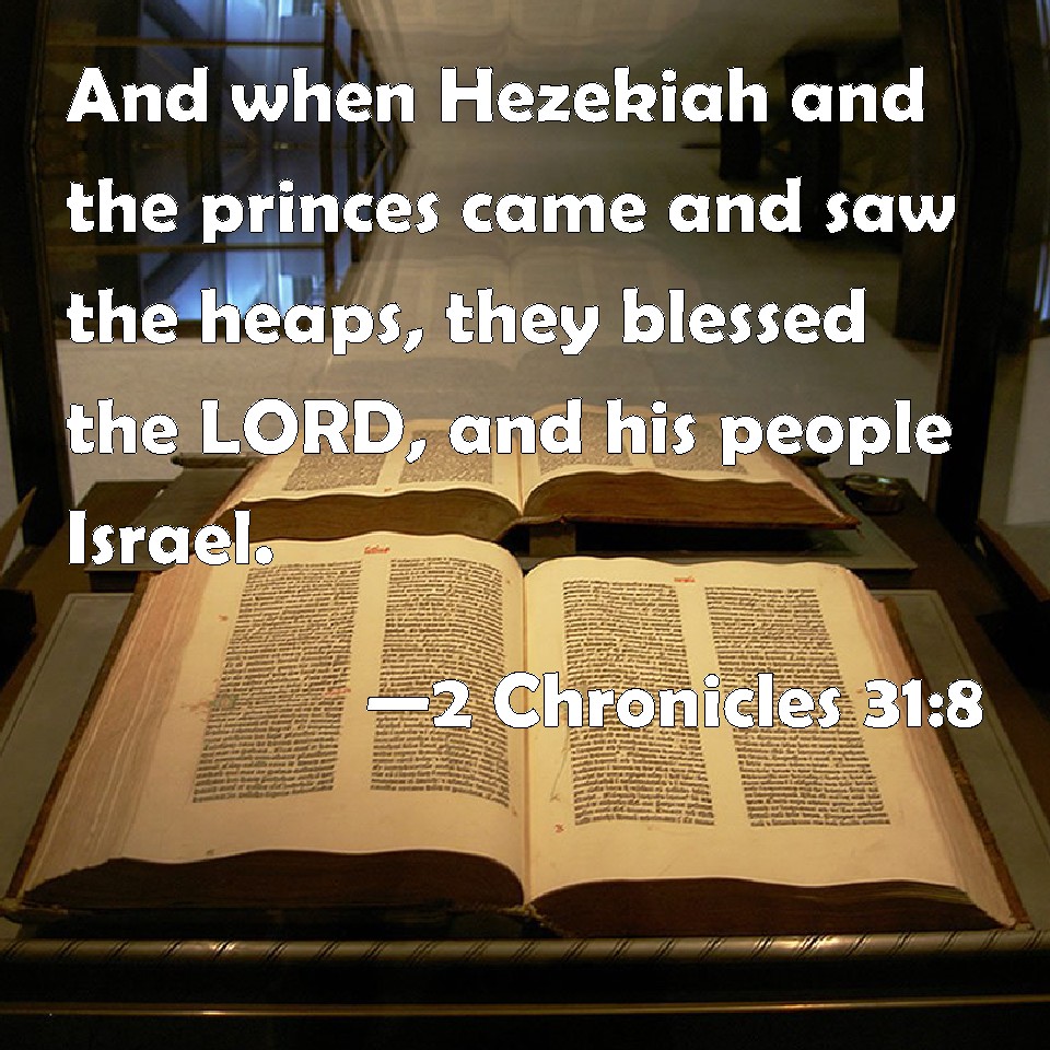 Choose a Background 2 Chronicles 31:8 And when Hezekiah and the princes came and saw the heaps, they blessed the LORD, and his people Israel. KJV: And when Hezekiah and the princes came and saw the heaps, they blessed the LORD, and his people Israel. DRB: And when Ezechias and his princes came in, they saw the heaps, and they blessed the Lord and the people of Israel. DBT: And Hezekiah and the princes came and saw the heaps, and they blessed Jehovah, and his people Israel. ERV: And when Hezekiah and the princes came and saw the heaps, they blessed the LORD, and his people Israel. WBT: And when Hezekiah and the princes came and saw the heaps, they blessed the LORD, and his people Israel. WEB: When Hezekiah and the princes came and saw the heaps, they blessed Yahweh, and his people Israel. YLT: And Hezekiah and the heads come in and see the heaps, and bless Jehovah and His people Israel,Links 2 Chronicles 31:8 NIV • 2 Chronicles 31:8 NLT • 2 Chronicles 31:8 ESV • 2 Chronicles 31:8 NASB • 2 Chronicles 31:8 KJV • 2 Chronicles 31:8 Interlinear • 2 Chronicles 31:8 Commentaries • 2 Chronicles 31:8 Parallel Texts • 2 Chronicles 31:8 Bible Apps • 2 Chronicles 31:8 Parallel • Bible Hub |