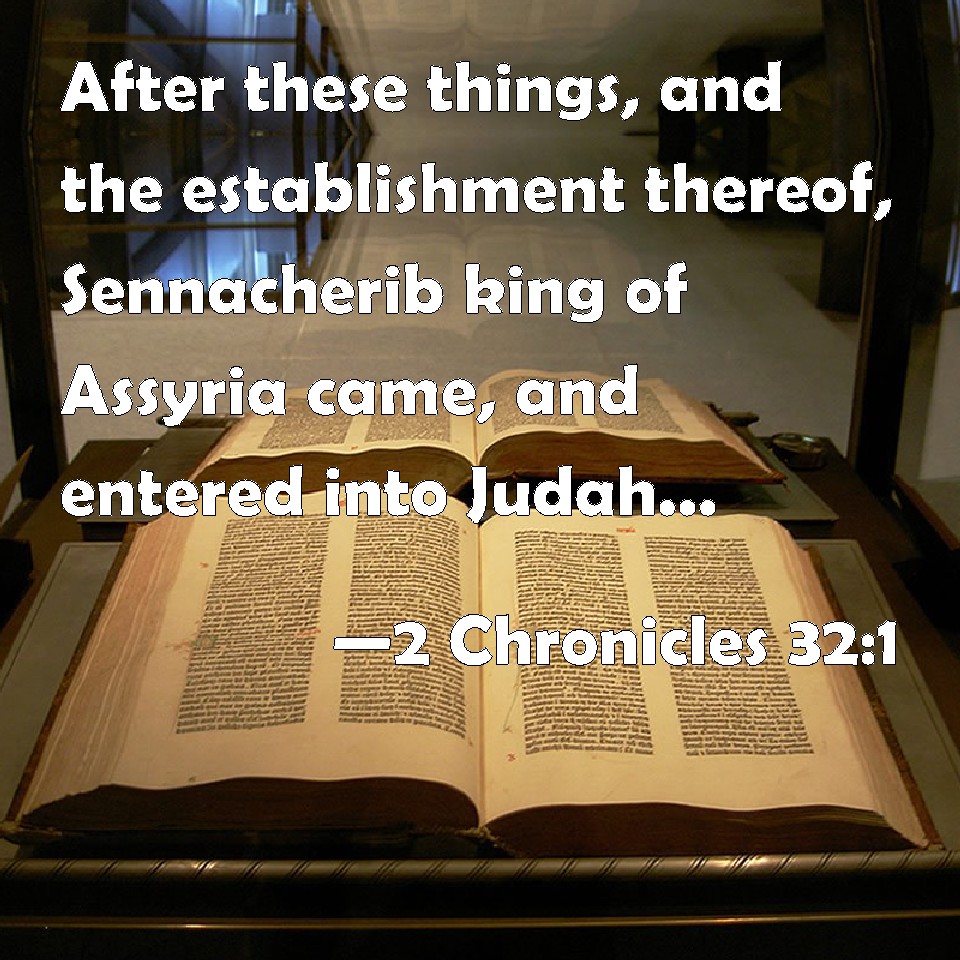 Choose a Background 2 Chronicles 32:1 After these things, and the establishment thereof, Sennacherib king of Assyria came, and entered into Judah, and encamped against the fenced cities, and thought to win them for himself. KJV: After these things, and the establishment thereof, Sennacherib king of Assyria came, and entered into Judah, and encamped against the fenced cities, and thought to win them for himself. DRB: After these things, and this truth, Sennacherib king of the Assyrians came and entered into Juda, and besieged the fenced cities, desiring to take them. DBT: After these things and this faithfulness, Sennacherib king of Assyria came and entered into Judah, and encamped against the fortified cities, and thought to break into them. ERV: After these things, and this faithfulness, Sennacherib king of Assyria came, and entered into Judah, and encamped against the fenced cities, and thought to win them for himself. WBT: After these things, and their establishment, Sennacherib king of Assyria came, and entered into Judah, and encamped against the fortified cities, and thought to win them for himself. WEB: After these things, and this faithfulness, Sennacherib king of Assyria came, and entered into Judah, and encamped against the fortified cities, and thought to win them for himself. YLT: After these things and this truth, come hath Sennacherib king of Asshur, yea, he cometh in to Judah, and encampeth against the cities of the bulwarks, and saith to rend them unto himself.Links 2 Chronicles 32:1 NIV • 2 Chronicles 32:1 NLT • 2 Chronicles 32:1 ESV • 2 Chronicles 32:1 NASB • 2 Chronicles 32:1 KJV • 2 Chronicles 32:1 Interlinear • 2 Chronicles 32:1 Commentaries • 2 Chronicles 32:1 Parallel Texts • 2 Chronicles 32:1 Bible Apps • 2 Chronicles 32:1 Parallel • Bible Hub |