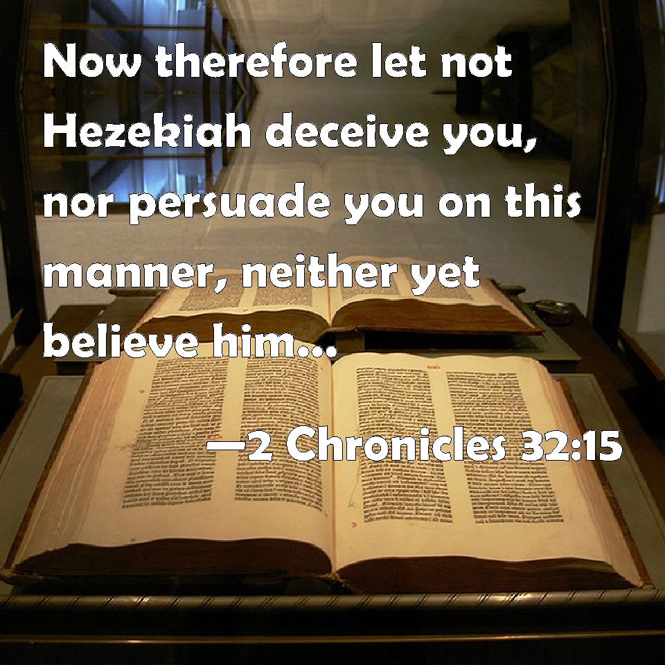 Choose a Background 2 Chronicles 32:15 Now therefore let not Hezekiah deceive you, nor persuade you on this manner, neither yet believe him: for no god of any nation or kingdom was able to deliver his people out of my hand, and out of the hand of my fathers: how much less shall your God deliver you out of my hand? KJV: Now therefore let not Hezekiah deceive you, nor persuade you on this manner, neither yet believe him: for no god of any nation or kingdom was able to deliver his people out of mine hand, and out of the hand of my fathers: how much less shall your God deliver you out of mine hand? DRB: Therefore let not Ezechias deceive you, nor delude you with a vain persuasion, and do not believe him. For if no god of all the nations and kingdoms, could deliver his people out of my hand, and out of the hand of my fathers, consequently neither shall your God be able to deliver you out of my hand. DBT: And now, let not Hezekiah deceive you, nor persuade you in this manner, neither yet believe him; for no +god of any nation or kingdom was able to deliver his people out of my hand, nor out of the hand of my fathers: how much less shall your God deliver you out of my hand? ERV: Now therefore let not Hezekiah deceive you, nor persuade you on this manner, neither believe ye him: for no god of any nation or kingdom was able to deliver his people out of mine hand, and out of the hand of my fathers: how much less shall your God deliver you out of mine hand? WBT: Now therefore let not Hezekiah deceive you, nor persuade you in this manner, neither yet believe him: for no god of any nation or kingdom hath been able to deliver his people out of my hand, and out of the hand of my fathers: how much less shall your God deliver you out of my hand? WEB: Now therefore don't let Hezekiah deceive you, nor persuade you in this way, neither believe him; for no god of any nation or kingdom was able to deliver his people out of my hand, and out of the hand of my fathers. How much less will your God deliver you out of my hand?" YLT: 'And, now, let not Hezekiah lift you up, nor persuade you thus, nor give credence to him, for no god of any nation and kingdom is able to deliver his people from my hand, and from the hand of my fathers: also, surely your God doth not deliver you from my hand!'Links 2 Chronicles 32:15 NIV • 2 Chronicles 32:15 NLT • 2 Chronicles 32:15 ESV • 2 Chronicles 32:15 NASB • 2 Chronicles 32:15 KJV • 2 Chronicles 32:15 Interlinear • 2 Chronicles 32:15 Commentaries • 2 Chronicles 32:15 Parallel Texts • 2 Chronicles 32:15 Bible Apps • 2 Chronicles 32:15 Parallel • Bible Hub |