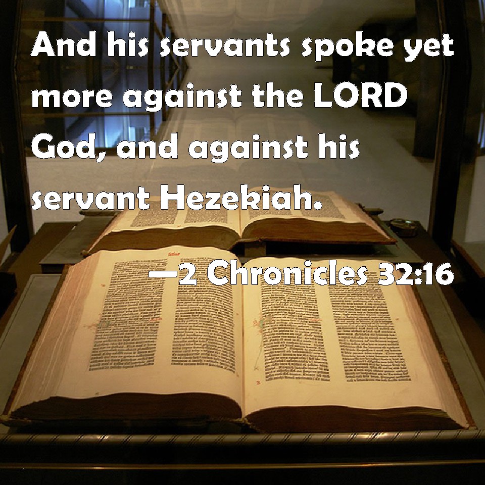 Choose a Background 2 Chronicles 32:16 And his servants spoke yet more against the LORD God, and against his servant Hezekiah. KJV: And his servants spake yet more against the LORD God, and against his servant Hezekiah. DRB: And many other things did his servants speak against the Lord God, and against Ezechias his servant. DBT: And his servants spoke yet more against Jehovah, the true God, and against his servant Hezekiah. ERV: And his servants spake yet more against the LORD God, and against his servant Hezekiah. WBT: And his servants spoke yet more against the LORD God, and against his servant Hezekiah. WEB: His servants spoke yet more against Yahweh God, and against his servant Hezekiah. YLT: And again have his servants spoken against Jehovah God, and against Hezekiah His servant,Links 2 Chronicles 32:16 NIV • 2 Chronicles 32:16 NLT • 2 Chronicles 32:16 ESV • 2 Chronicles 32:16 NASB • 2 Chronicles 32:16 KJV • 2 Chronicles 32:16 Interlinear • 2 Chronicles 32:16 Commentaries • 2 Chronicles 32:16 Parallel Texts • 2 Chronicles 32:16 Bible Apps • 2 Chronicles 32:16 Parallel • Bible Hub |