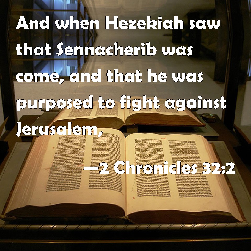 Choose a Background 2 Chronicles 32:2 And when Hezekiah saw that Sennacherib was come, and that he was purposed to fight against Jerusalem, KJV: And when Hezekiah saw that Sennacherib was come, and that he was purposed to fight against Jerusalem, DRB: And when Ezechias saw that Sennacherib was come, and that the whole force of the war was turning against Jerusalem, DBT: And when Hezekiah saw that Sennacherib was come, and that he was minded to fight against Jerusalem, ERV: And when Hezekiah saw that Sennacherib was come, and that he was purposed to fight against Jerusalem, WBT: And when Hezekiah saw that Sennacherib had come, and that he purposed to fight against Jerusalem, WEB: When Hezekiah saw that Sennacherib was come, and that he was purposed to fight against Jerusalem, YLT: And Hezekiah seeth that Sennacherib hath come, and his face is to the battle against Jerusalem,Links 2 Chronicles 32:2 NIV • 2 Chronicles 32:2 NLT • 2 Chronicles 32:2 ESV • 2 Chronicles 32:2 NASB • 2 Chronicles 32:2 KJV • 2 Chronicles 32:2 Interlinear • 2 Chronicles 32:2 Commentaries • 2 Chronicles 32:2 Parallel Texts • 2 Chronicles 32:2 Bible Apps • 2 Chronicles 32:2 Parallel • Bible Hub |