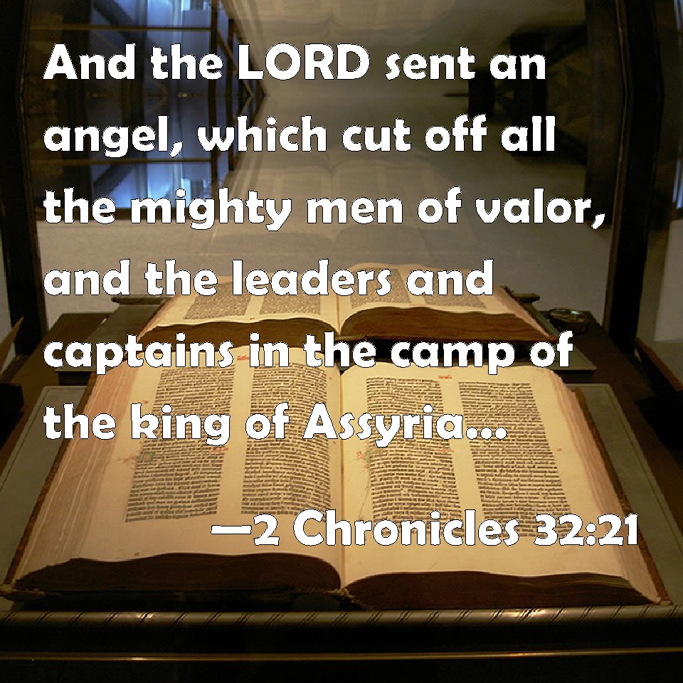 2 Chronicles 32:21 And the LORD sent an angel, which cut off all the mighty men of valor, and the leaders and captains in the camp of the king of Assyria. So he returned with shame of face to his own land. And when he was come into the house of his god, they that came forth of his own bowels slew him there with the sword.