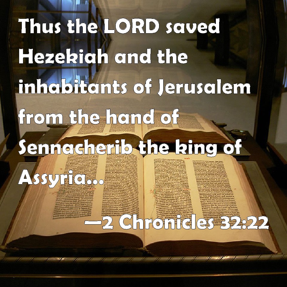 Choose a Background 2 Chronicles 32:22 Thus the LORD saved Hezekiah and the inhabitants of Jerusalem from the hand of Sennacherib the king of Assyria, and from the hand of all other, and guided them on every side. KJV: Thus the LORD saved Hezekiah and the inhabitants of Jerusalem from the hand of Sennacherib the king of Assyria, and from the hand of all other, and guided them on every side. DRB: And the Lord saved Ezechias and the inhabitants of Jerusalem, out of the hand of Sennacherib king of the Assyrians, and out of the hand of all, and gave them treasures on every side. DBT: And Jehovah saved Hezekiah and the inhabitants of Jerusalem from the hand of Sennacherib the king of Assyria, and from the hand of all, and protected them on every side. ERV: Thus the LORD saved Hezekiah and the inhabitants of Jerusalem from the hand of Sennacherib the king of Assyria, and from the hand of all other, and guided them on every side. WBT: Thus the LORD saved Hezekiah and the inhabitants of Jerusalem from the hand of Sennacherib the king of Assyria, and from the hand of all others, and guided them on every side. WEB: Thus Yahweh saved Hezekiah and the inhabitants of Jerusalem from the hand of Sennacherib the king of Assyria, and from the hand of all [others], and guided them on every side. YLT: And Jehovah saveth Hezekiah and the inhabitants of Jerusalem from the hand of Sennacherib king of Asshur, and from the hand of all, and He leadeth them round about;Links 2 Chronicles 32:22 NIV • 2 Chronicles 32:22 NLT • 2 Chronicles 32:22 ESV • 2 Chronicles 32:22 NASB • 2 Chronicles 32:22 KJV • 2 Chronicles 32:22 Interlinear • 2 Chronicles 32:22 Commentaries • 2 Chronicles 32:22 Parallel Texts • 2 Chronicles 32:22 Bible Apps • 2 Chronicles 32:22 Parallel • Bible Hub |