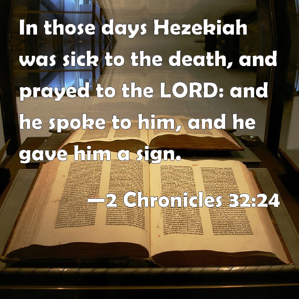 Choose a Background 2 Chronicles 32:24 In those days Hezekiah was sick to the death, and prayed to the LORD: and he spoke to him, and he gave him a sign. KJV: In those days Hezekiah was sick to the death, and prayed unto the LORD: and he spake unto him, and he gave him a sign. DRB: In those days Ezechias was sick even to death, and he prayed to the Lord: and he heard him, and gave him a sign. DBT: In those days Hezekiah was sick unto death, and he prayed to Jehovah; and he spoke to him and gave him a sign. ERV: In those days Hezekiah was sick even unto death: and he prayed unto the LORD; and he spake unto him, and gave him a sign. WBT: In those days Hezekiah was sick and near to death, and he prayed to the LORD: and he spoke to him, and he gave him a sign. WEB: In those days Hezekiah was sick even to death: and he prayed to Yahweh; and he spoke to him, and gave him a sign. YLT: In those days hath Hezekiah been sick even unto death, and he prayeth unto Jehovah, and He speaketh to him, and a wonder hath appointed for him;Links 2 Chronicles 32:24 NIV • 2 Chronicles 32:24 NLT • 2 Chronicles 32:24 ESV • 2 Chronicles 32:24 NASB • 2 Chronicles 32:24 KJV • 2 Chronicles 32:24 Interlinear • 2 Chronicles 32:24 Commentaries • 2 Chronicles 32:24 Parallel Texts • 2 Chronicles 32:24 Bible Apps • 2 Chronicles 32:24 Parallel • Bible Hub |