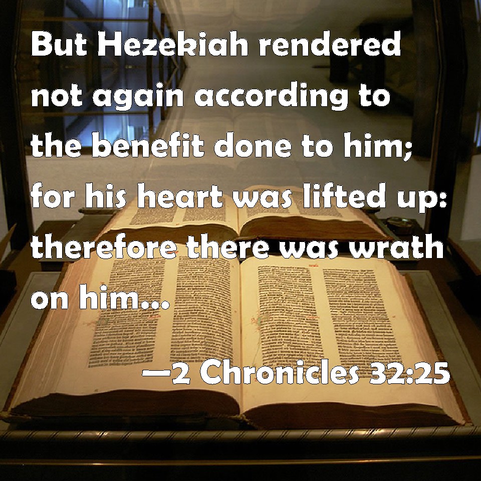 2 Chronicles 32:25 But Hezekiah rendered not again according to the benefit done to him; for his heart was lifted up: therefore there was wrath on him, and on Judah and Jerusalem.