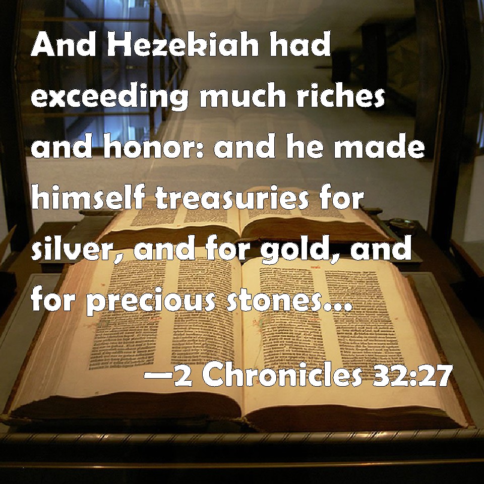Choose a Background 2 Chronicles 32:27 And Hezekiah had exceeding much riches and honor: and he made himself treasuries for silver, and for gold, and for precious stones, and for spices, and for shields, and for all manner of pleasant jewels; KJV: And Hezekiah had exceeding much riches and honour: and he made himself treasuries for silver, and for gold, and for precious stones, and for spices, and for shields, and for all manner of pleasant jewels; DRB: And Ezechias was rich, and very glorious, and he gathered himself great treasures of silver and of gold, and of precious stones, of spices, and of arms, of all kinds, and of vessels of great price. DBT: And Hezekiah had very much riches and honour; and he made himself treasuries for silver, and for gold, and for precious stones, and for spices, and for shields, and for all manner of pleasant vessels; ERV: And Hezekiah had exceeding much riches and honour: and he provided him treasuries for silver, and for gold, and for precious stones, and for spices, and for shields, and for all manner of goodly vessels; WBT: And Hezekiah had very great riches and honor: and he made himself treasuries for silver, and for gold, and for precious stones, and for spices, and for shields, and for all manner of pleasant jewels: WEB: Hezekiah had exceeding much riches and honor: and he provided him treasuries for silver, and for gold, and for precious stones, and for spices, and for shields, and for all kinds of goodly vessels; YLT: And Hezekiah hath riches and honour very much, and treasures he hath made to himself of silver, and of gold, and of precious stone, and of spices, and of shields, and of all kinds of desirable vessels,Links 2 Chronicles 32:27 NIV • 2 Chronicles 32:27 NLT • 2 Chronicles 32:27 ESV • 2 Chronicles 32:27 NASB • 2 Chronicles 32:27 KJV • 2 Chronicles 32:27 Interlinear • 2 Chronicles 32:27 Commentaries • 2 Chronicles 32:27 Parallel Texts • 2 Chronicles 32:27 Bible Apps • 2 Chronicles 32:27 Parallel • Bible Hub |