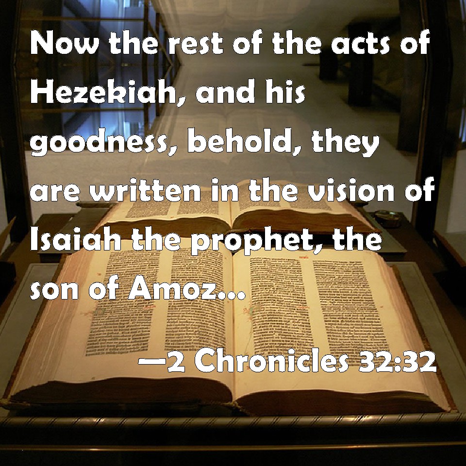 Choose a Background 2 Chronicles 32:32 Now the rest of the acts of Hezekiah, and his goodness, behold, they are written in the vision of Isaiah the prophet, the son of Amoz, and in the book of the kings of Judah and Israel. KJV: Now the rest of the acts of Hezekiah, and his goodness, behold, they are written in the vision of Isaiah the prophet, the son of Amoz, and in the book of the kings of Judah and Israel. DRB: Now the rest of the acts of Ezechias, and of his mercies are written in the book of the kings of Juda and Israel. DBT: And the rest of the acts of Hezekiah and his good deeds, behold, they are written in the vision of the prophet Isaiah the son of Amoz in the book of the kings of Judah and Israel. ERV: Now the rest of the acts of Hezekiah, and his good deeds, behold, they are written in the vision of Isaiah the prophet the son of Amoz, in the book of the kings of Judah and Israel. WBT: Now the rest of the acts of Hezekiah, and his goodness, behold, they are written in the vision of Isaiah the prophet, the son of Amoz, and in the book of the kings of Judah and Israel. WEB: Now the rest of the acts of Hezekiah, and his good deeds, behold, they are written in the vision of Isaiah the prophet the son of Amoz, in the book of the kings of Judah and Israel. YLT: And the rest of the matters of Hezekiah, and his kind acts, lo, they are written in the vision of Isaiah son of Amoz the prophet, on the book of the kings of Judah and Israel.Links 2 Chronicles 32:32 NIV • 2 Chronicles 32:32 NLT • 2 Chronicles 32:32 ESV • 2 Chronicles 32:32 NASB • 2 Chronicles 32:32 KJV • 2 Chronicles 32:32 Interlinear • 2 Chronicles 32:32 Commentaries • 2 Chronicles 32:32 Parallel Texts • 2 Chronicles 32:32 Bible Apps • 2 Chronicles 32:32 Parallel • Bible Hub |