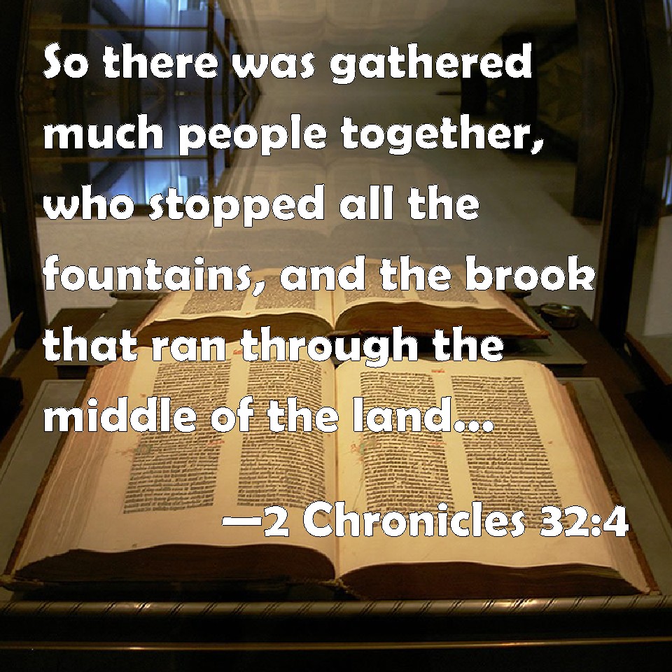 Choose a Background 2 Chronicles 32:4 So there was gathered much people together, who stopped all the fountains, and the brook that ran through the middle of the land, saying, Why should the kings of Assyria come, and find much water? KJV: So there was gathered much people together, who stopped all the fountains, and the brook that ran through the midst of the land, saying, Why should the kings of Assyria come, and find much water? DRB: He gathered together a very great multitude, and they stopped up all the springs, and the brook, that ran through the midst of the land, saying: Lest the kings of the Assyrians should come, and And abundance of water. DBT: And there was gathered together much people, and they stopped all the fountains, and the torrent that flows through the midst of the land, saying, Why should the kings of Assyria come and find much water? ERV: So there was gathered much people together, and they stopped all the fountains, and the brook that flowed through the midst of the land, saying, Why should the kings of Assyria come and find much water? WBT: So there were assembled many people, who stopped all the fountains, and the brook that ran through the midst of the land, saying, Why should the kings of Assyria come, and find much water? WEB: So many people gathered together, and they stopped all the springs, and the brook that flowed through the midst of the land, saying, "Why should the kings of Assyria come, and find much water?" YLT: and much people are gathered, and they stop all the fountains and the brook that is rushing into the midst of the land, saying, 'Why do the kings of Asshur come, and have found much water?'Links 2 Chronicles 32:4 NIV • 2 Chronicles 32:4 NLT • 2 Chronicles 32:4 ESV • 2 Chronicles 32:4 NASB • 2 Chronicles 32:4 KJV • 2 Chronicles 32:4 Interlinear • 2 Chronicles 32:4 Commentaries • 2 Chronicles 32:4 Parallel Texts • 2 Chronicles 32:4 Bible Apps • 2 Chronicles 32:4 Parallel • Bible Hub |