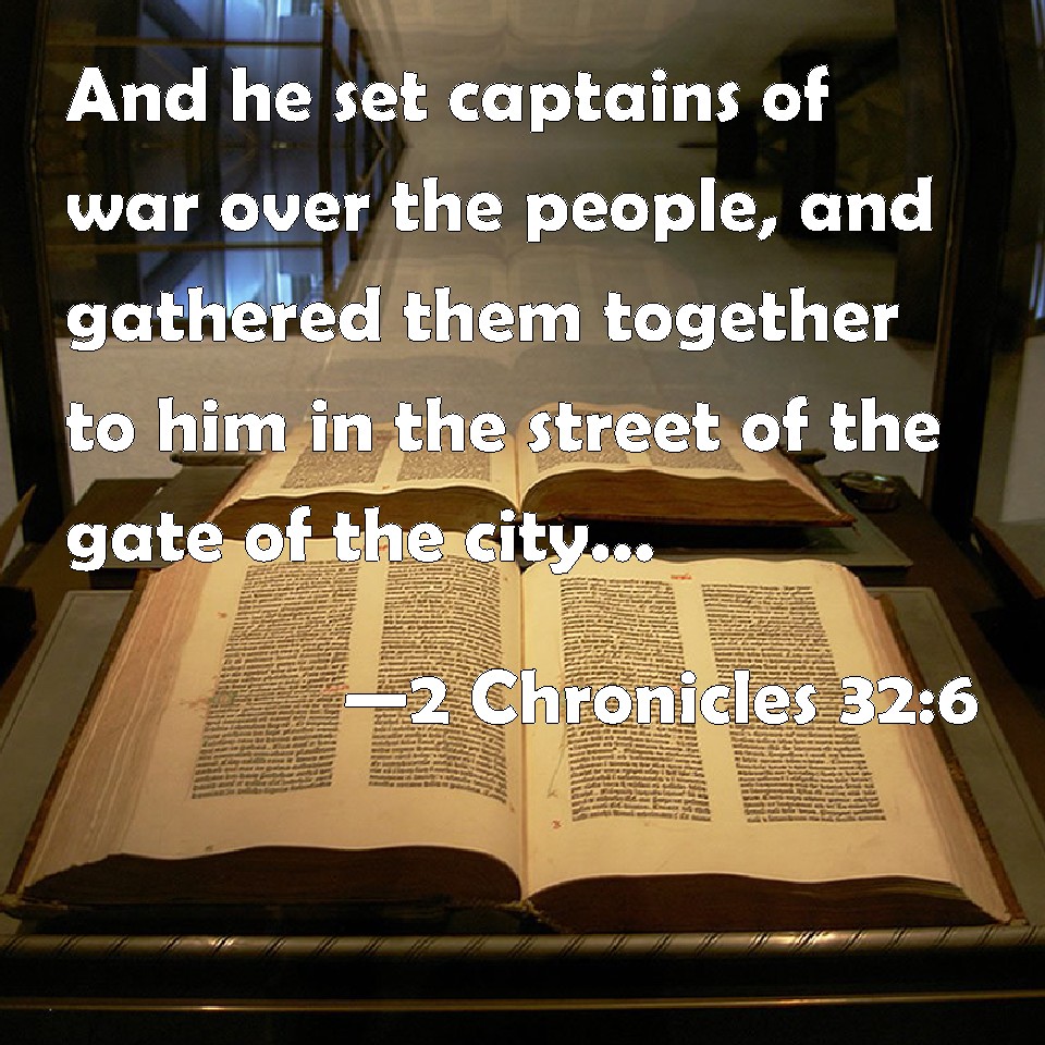 Choose a Background 2 Chronicles 32:6 And he set captains of war over the people, and gathered them together to him in the street of the gate of the city, and spoke comfortably to them, saying, KJV: And he set captains of war over the people, and gathered them together to him in the street of the gate of the city, and spake comfortably to them, saying, DRB: And he appointed captains of the soldiers of the army: and he called them all together in the street of the gate of the city, and spoke to their heart, saying: DBT: And he set captains of war over the people, and assembled them to him on the open place at the gate of the city, and spoke consolingly to them saying, ERV: And he set captains of war over the people, and gathered them together to him in the broad place at the gate of the city, and spake comfortably to them, saying, WBT: And he set captains of war over the people, and assembled them to him in the street of the gate of the city, and encouraged them, saying, WEB: He set captains of war over the people, and gathered them together to him in the broad place at the gate of the city, and spoke comfortably to them, saying, YLT: And he putteth heads of war over the people, and gathereth them unto him, unto the broad place of a gate of the city, and speaketh unto their heart, saying,Links 2 Chronicles 32:6 NIV • 2 Chronicles 32:6 NLT • 2 Chronicles 32:6 ESV • 2 Chronicles 32:6 NASB • 2 Chronicles 32:6 KJV • 2 Chronicles 32:6 Interlinear • 2 Chronicles 32:6 Commentaries • 2 Chronicles 32:6 Parallel Texts • 2 Chronicles 32:6 Bible Apps • 2 Chronicles 32:6 Parallel • Bible Hub |