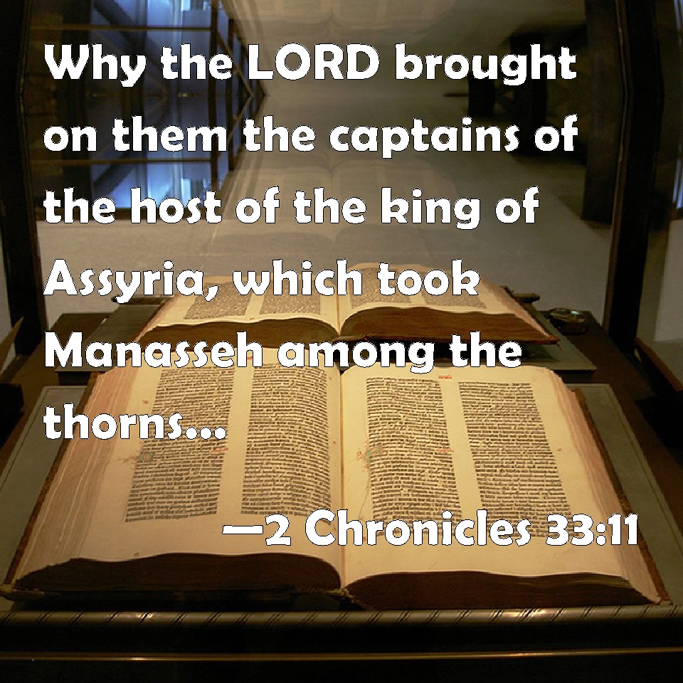 Choose a Background 2 Chronicles 33:11 Why the LORD brought on them the captains of the host of the king of Assyria, which took Manasseh among the thorns, and bound him with fetters, and carried him to Babylon. KJV: Wherefore the LORD brought upon them the captains of the host of the king of Assyria, which took Manasseh among the thorns, and bound him with fetters, and carried him to Babylon. DRB: Therefore he brought upon them the captains of the army of the king of the Assyrians: and they took Manasses, and carried him bound with chains and fetters to Babylon. DBT: And Jehovah brought upon them the captains of the host of the king of Assyria, who took Manasseh with fetters, and bound him with chains of brass, and carried him to Babylon. ERV: Wherefore the LORD brought upon them the captains of the host of the king of Assyria, which took Manasseh in chains, and bound him with fetters, and carried him to Babylon. WBT: Wherefore the LORD brought upon them the captains of the army of the king of Assyria, who took Manasseh among the thorns, and bound him with fetters, and carried him to Babylon. WEB: Therefore Yahweh brought on them the captains of the army of the king of Assyria, who took Manasseh in chains, and bound him with fetters, and carried him to Babylon. YLT: and Jehovah bringeth in against them the heads of the host that the king of Asshur hath, and they capture Manasseh among the thickets, and bind him with brazen fetters, and cause him to go to Babylon.Links 2 Chronicles 33:11 NIV • 2 Chronicles 33:11 NLT • 2 Chronicles 33:11 ESV • 2 Chronicles 33:11 NASB • 2 Chronicles 33:11 KJV • 2 Chronicles 33:11 Interlinear • 2 Chronicles 33:11 Commentaries • 2 Chronicles 33:11 Parallel Texts • 2 Chronicles 33:11 Bible Apps • 2 Chronicles 33:11 Parallel • Bible Hub |
