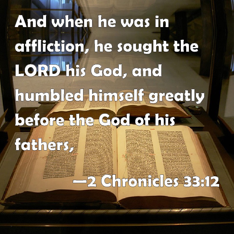 Choose a Background 2 Chronicles 33:12 And when he was in affliction, he sought the LORD his God, and humbled himself greatly before the God of his fathers, KJV: And when he was in affliction, he besought the LORD his God, and humbled himself greatly before the God of his fathers, DRB: And after that he was in distress he prayed to the Lord his God: and did penance exceedingly before the God of his fathers. DBT: And when he was in affliction, he besought Jehovah his God, and humbled himself greatly before the God of his fathers, ERV: And when he was in distress, he besought the LORD his God, and humbled himself greatly before the God of his fathers. WBT: And when he was in affliction, he besought the LORD his God, and humbled himself greatly before the God of his fathers, WEB: When he was in distress, he begged Yahweh his God, and humbled himself greatly before the God of his fathers. YLT: And when he is in distress he hath appeased the face of Jehovah his God, and is humbled exceedingly before the God of his fathers,Links 2 Chronicles 33:12 NIV • 2 Chronicles 33:12 NLT • 2 Chronicles 33:12 ESV • 2 Chronicles 33:12 NASB • 2 Chronicles 33:12 KJV • 2 Chronicles 33:12 Interlinear • 2 Chronicles 33:12 Commentaries • 2 Chronicles 33:12 Parallel Texts • 2 Chronicles 33:12 Bible Apps • 2 Chronicles 33:12 Parallel • Bible Hub |