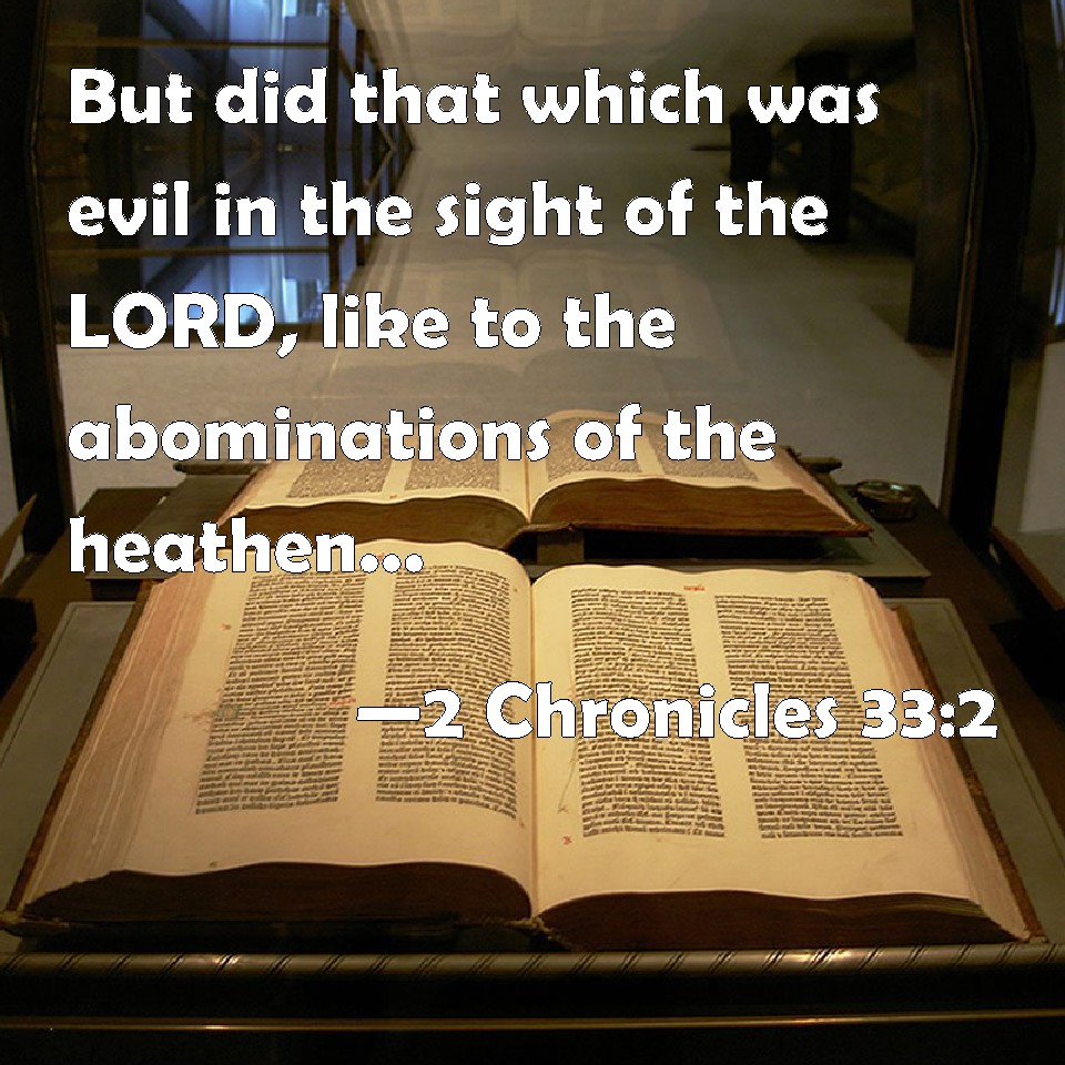Choose a Background 2 Chronicles 33:2 But did that which was evil in the sight of the LORD, like to the abominations of the heathen, whom the LORD had cast out before the children of Israel. KJV: But did that which was evil in the sight of the LORD, like unto the abominations of the heathen, whom the LORD had cast out before the children of Israel. DRB: And he did evil before the Lord, according to all the abominations of the nations, which the Lord cast out before the children of Israel: DBT: And he did evil in the sight of Jehovah, like the abominations of the nations that Jehovah had dispossessed from before the children of Israel. ERV: And he did that which was evil in the sight of the LORD, after the abominations of the heathen, whom the LORD cast out before the children of Israel. WBT: But did that which was evil in the sight of the LORD, like the abominations of the heathen, whom the LORD had cast out before the children of Israel. WEB: He did that which was evil in the sight of Yahweh, after the abominations of the nations whom Yahweh cast out before the children of Israel. YLT: and he doth the evil thing in the eyes of Jehovah, like the abominations of the nations that Jehovah dispossessed from the presence of the sons of Israel,Links 2 Chronicles 33:2 NIV • 2 Chronicles 33:2 NLT • 2 Chronicles 33:2 ESV • 2 Chronicles 33:2 NASB • 2 Chronicles 33:2 KJV • 2 Chronicles 33:2 Interlinear • 2 Chronicles 33:2 Commentaries • 2 Chronicles 33:2 Parallel Texts • 2 Chronicles 33:2 Bible Apps • 2 Chronicles 33:2 Parallel • Bible Hub |