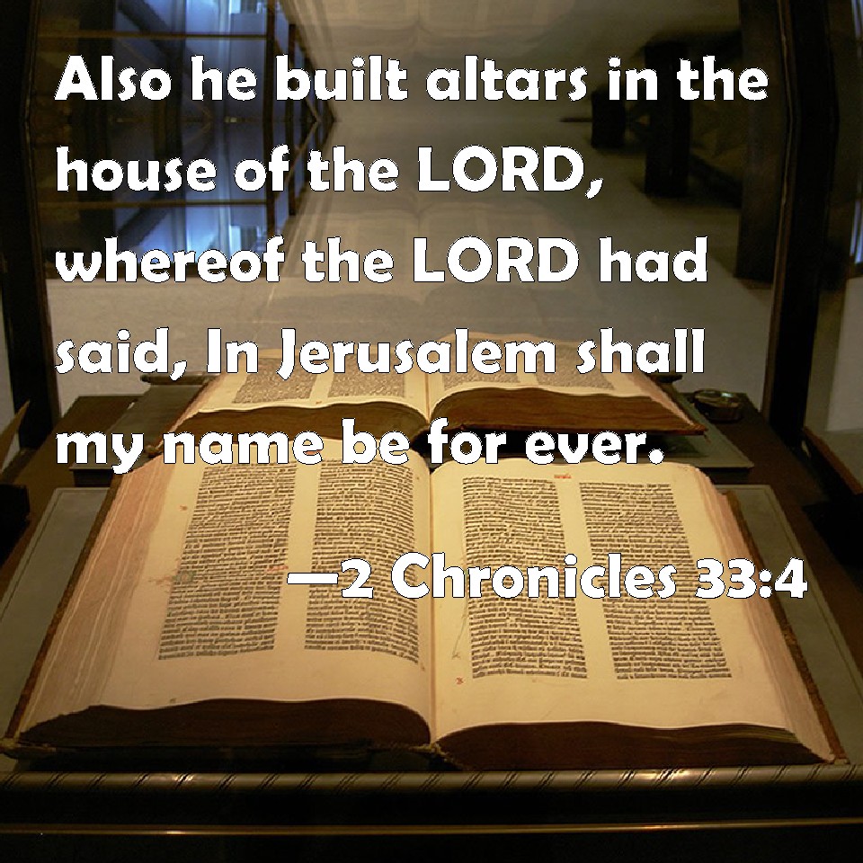 Choose a Background 2 Chronicles 33:4 Also he built altars in the house of the LORD, whereof the LORD had said, In Jerusalem shall my name be for ever. KJV: Also he built altars in the house of the LORD, whereof the LORD had said, In Jerusalem shall my name be for ever. DRB: He built also altars in the house of the Lord, whereof the Lord had said: In Jerusalem shall my name be for ever. DBT: And he built altars in the house of Jehovah, of which Jehovah had said, In Jerusalem shall my name be for ever. ERV: And he built altars in the house of the LORD, whereof the LORD said, In Jerusalem shall my name be forever. WBT: Also he built altars in the house of the LORD, of which the LORD had said, In Jerusalem shall my name be for ever. WEB: He built altars in the house of Yahweh, of which Yahweh said, "My name shall be in Jerusalem forever." YLT: And he hath built altars in the house of Jehovah of which Jehovah had said, 'In Jerusalem is My name to the age.'Links 2 Chronicles 33:4 NIV • 2 Chronicles 33:4 NLT • 2 Chronicles 33:4 ESV • 2 Chronicles 33:4 NASB • 2 Chronicles 33:4 KJV • 2 Chronicles 33:4 Interlinear • 2 Chronicles 33:4 Commentaries • 2 Chronicles 33:4 Parallel Texts • 2 Chronicles 33:4 Bible Apps • 2 Chronicles 33:4 Parallel • Bible Hub |
