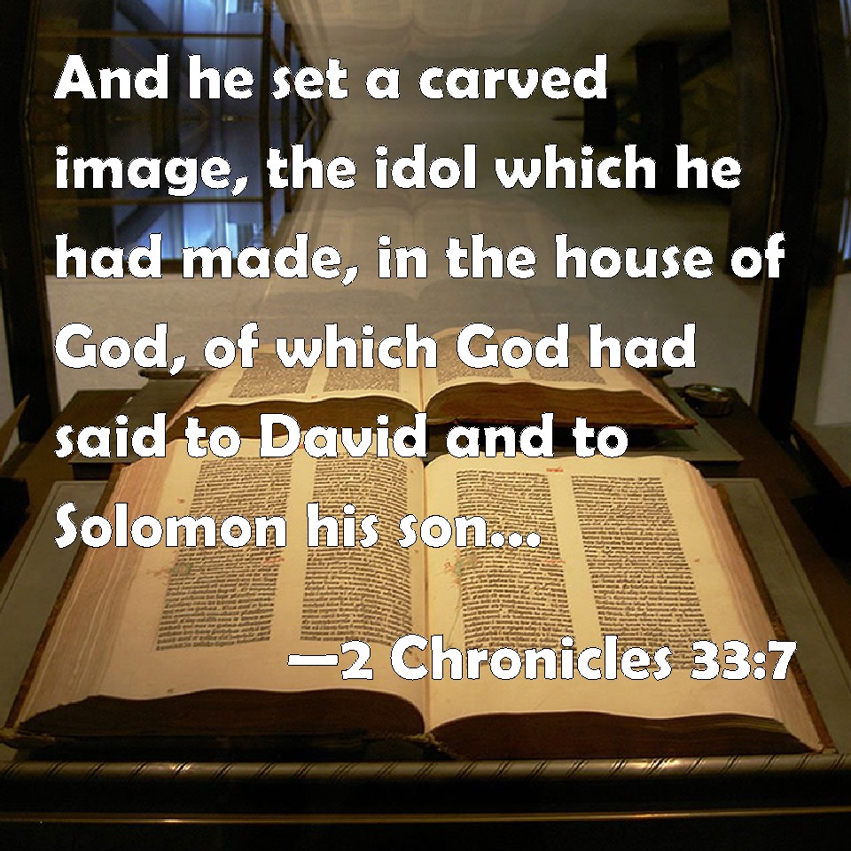 Choose a Background 2 Chronicles 33:7 And he set a carved image, the idol which he had made, in the house of God, of which God had said to David and to Solomon his son, In this house, and in Jerusalem, which I have chosen before all the tribes of Israel, will I put my name for ever: KJV: And he set a carved image, the idol which he had made, in the house of God, of which God had said to David and to Solomon his son, In this house, and in Jerusalem, which I have chosen before all the tribes of Israel, will I put my name for ever: DRB: He set also a graven, and a molten statue in the house of God, of which God had said to David, and to Solomon his son: In this house, and in Jerusalem, which I have chosen out of all the tribes of Israel, will I put my name for ever. DBT: And he set the graven image of the idol that he had made, in the house of God, of which God had said to David and to Solomon his son, In this house, and in Jerusalem, which I have chosen out of all the tribes of Israel, will I put my name for ever; ERV: And he set the graven image of the idol, which he had made in the house of God, of which God said to David and to Solomon his son, In this house, and in Jerusalem, which I have chosen out of all the tribes of Israel, will I put my name for ever: WBT: And he set a carved image, the idol which he had made, in the house of God, of which God had said to David and to Solomon his son, In this house, and in Jerusalem, which I have chosen before all the tribes of Israel, will I put my name for ever: WEB: He set the engraved image of the idol, which he had made, in the house of God, of which God said to David and to Solomon his son, "In this house, and in Jerusalem, which I have chosen out of all the tribes of Israel, will I put my name forever: YLT: And he placeth the graven image of the idol that he made in the house of God, of which God said unto David, and unto Solomon his son, 'In this house, and in Jerusalem that I have chosen out of all the tribes of Israel, I put My name to the age,Links 2 Chronicles 33:7 NIV • 2 Chronicles 33:7 NLT • 2 Chronicles 33:7 ESV • 2 Chronicles 33:7 NASB • 2 Chronicles 33:7 KJV • 2 Chronicles 33:7 Interlinear • 2 Chronicles 33:7 Commentaries • 2 Chronicles 33:7 Parallel Texts • 2 Chronicles 33:7 Bible Apps • 2 Chronicles 33:7 Parallel • Bible Hub |