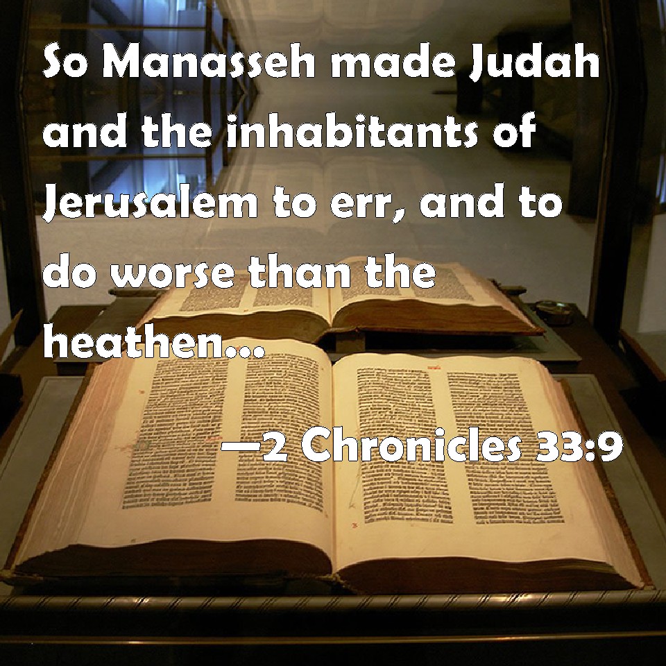 Choose a Background 2 Chronicles 33:9 So Manasseh made Judah and the inhabitants of Jerusalem to err, and to do worse than the heathen, whom the LORD had destroyed before the children of Israel. KJV: So Manasseh made Judah and the inhabitants of Jerusalem to err, and to do worse than the heathen, whom the LORD had destroyed before the children of Israel. DRB: So Manasses seduced Juda, and the inhabitants of Jerusalem, to do evil beyond all the nations, which the Lord had destroyed before the face of the children of Israel. DBT: And Manasseh led Judah and the inhabitants of Jerusalem astray, to do more evil than the nations that Jehovah had destroyed from before the children of Israel. ERV: And Manasseh made Judah and the inhabitants of Jerusalem to err, so that they did evil more than did the nations, whom the LORD destroyed before the children of Israel. WBT: So Manasseh made Judah and the inhabitants of Jerusalem to err, and to do worse than the heathen, whom the LORD had destroyed before the children of Israel. WEB: Manasseh seduced Judah and the inhabitants of Jerusalem, so that they did evil more than did the nations whom Yahweh destroyed before the children of Israel. YLT: And Manasseh maketh Judah and the inhabitants of Jerusalem to err, to do evil above the nations that Jehovah destroyed from the presence of the sons of Israel.Links 2 Chronicles 33:9 NIV • 2 Chronicles 33:9 NLT • 2 Chronicles 33:9 ESV • 2 Chronicles 33:9 NASB • 2 Chronicles 33:9 KJV • 2 Chronicles 33:9 Interlinear • 2 Chronicles 33:9 Commentaries • 2 Chronicles 33:9 Parallel Texts • 2 Chronicles 33:9 Bible Apps • 2 Chronicles 33:9 Parallel • Bible Hub |