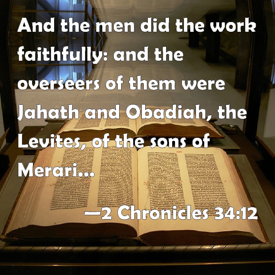 Choose a Background 2 Chronicles 34:12 And the men did the work faithfully: and the overseers of them were Jahath and Obadiah, the Levites, of the sons of Merari; and Zechariah and Meshullam, of the sons of the Kohathites, to set it forward; and other of the Levites, all that could skill of instruments of music. KJV: And the men did the work faithfully: and the overseers of them were Jahath and Obadiah, the Levites, of the sons of Merari; and Zechariah and Meshullam, of the sons of the Kohathites, to set it forward; and other of the Levites, all that could skill of instruments of musick. DRB: And they did all faithfully. Now the overseers of the workmen were Jahath and Abdias of the sons of Merari, Zacharias and Mosollam of the sons of Caath, who hastened the work: all Levites skilful to play on instruments. DBT: And the men did the work faithfully. And over them were appointed Jahath and Obadiah, Levites, of the children of Merari, and Zechariah and Meshullam, of the children of the Kohathites, for the oversight; and all these Levites were skilled in instruments of music. ERV: And the men did the work faithfully: and the overseers of them were Jahath and Obadiah, the Levites, of the sons of Merari; and Zechariah and Meshullam, of the sons of the Kohathites, to set it forward: and other of the Levites, all that could skill of instruments of music. WBT: And the men did the work faithfully: and the overseers of them were Jahath and Obadiah, the Levites, of the sons of Merari; and Zechariah and Meshullam, of the sons of the Kohathites, to superintend it; and others of the Levites, all that had skill in instruments of music. WEB: The men did the work faithfully: and the overseers of them were Jahath and Obadiah, the Levites, of the sons of Merari; and Zechariah and Meshullam, of the sons of the Kohathites, to set it forward; and [others of] the Levites, all who were skillful with instruments of music. YLT: And the men are working faithfully in the business, and over them are appointed Jahath and Obadiah, the Levites, of the sons of Merari, and Zechariah and Meshullam, of the sons of the Kohathite, to overlook; and of the Levites, every one understanding about instruments of song,Links 2 Chronicles 34:12 NIV • 2 Chronicles 34:12 NLT • 2 Chronicles 34:12 ESV • 2 Chronicles 34:12 NASB • 2 Chronicles 34:12 KJV • 2 Chronicles 34:12 Interlinear • 2 Chronicles 34:12 Commentaries • 2 Chronicles 34:12 Parallel Texts • 2 Chronicles 34:12 Bible Apps • 2 Chronicles 34:12 Parallel • Bible Hub |