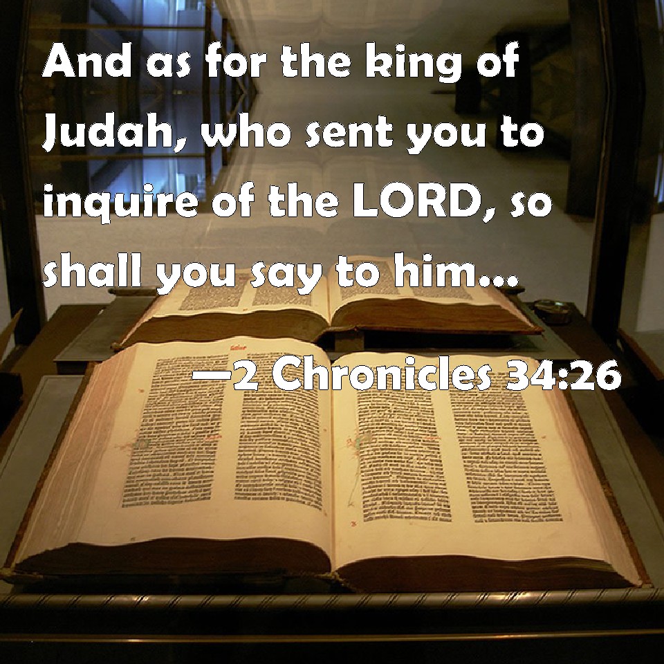 Choose a Background 2 Chronicles 34:26 And as for the king of Judah, who sent you to inquire of the LORD, so shall you say to him, Thus said the LORD God of Israel concerning the words which you have heard; KJV: And as for the king of Judah, who sent you to inquire of the LORD, so shall ye say unto him, Thus saith the LORD God of Israel concerning the words which thou hast heard; DRB: But as to the king of Juda that sent you to beseech the Lord, thus shall you say to him: Thus saith the Lord the God of Israel: Because thou hast heard the words of this book, DBT: But to the king of Judah, who sent you to inquire of Jehovah, thus shall ye say to him: Thus saith Jehovah the God of Israel touching the words which thou hast heard: ERV: But unto the king of Judah, who sent you to inquire of the LORD, thus shall ye say to him, Thus saith the LORD, the God of Israel: As touching the words which thou hast heard, WBT: And as for the king of Judah, who sent you to inquire of the LORD, so shall ye say to him, Thus saith the LORD God of Israel concerning the words which thou hast heard; WEB: But to the king of Judah, who sent you to inquire of Yahweh, thus you shall tell him, 'Thus says Yahweh, the God of Israel: "As touching the words which you have heard, YLT: 'And unto the king of Judah, who is sending you to inquire of Jehovah, thus do ye say unto him: Thus said Jehovah God of Israel, whose words thou hast heard:Links 2 Chronicles 34:26 NIV • 2 Chronicles 34:26 NLT • 2 Chronicles 34:26 ESV • 2 Chronicles 34:26 NASB • 2 Chronicles 34:26 KJV • 2 Chronicles 34:26 Interlinear • 2 Chronicles 34:26 Commentaries • 2 Chronicles 34:26 Parallel Texts • 2 Chronicles 34:26 Bible Apps • 2 Chronicles 34:26 Parallel • Bible Hub |