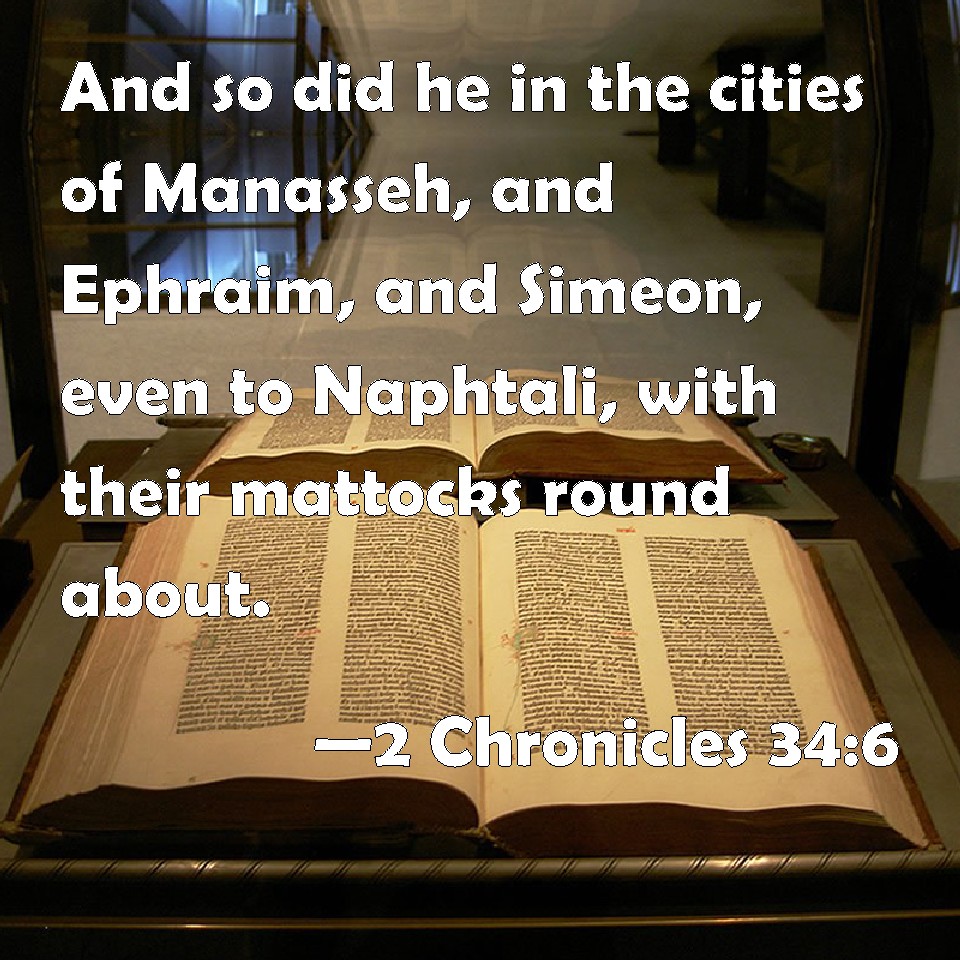 Choose a Background 2 Chronicles 34:6 And so did he in the cities of Manasseh, and Ephraim, and Simeon, even to Naphtali, with their mattocks round about. KJV: And so did he in the cities of Manasseh, and Ephraim, and Simeon, even unto Naphtali, with their mattocks round about. DRB: And in the cities of Manasses, and of Ephraim, and of Simeon, even to Nephtali he demolished all. DBT: And so did he in the cities of Manasseh and Ephraim and Simeon, even to Naphtali, in their ruins round about; ERV: And so did he in the cities of Manasseh and Ephraim and Simeon, even unto Napthali, in their ruins round about. WBT: And so did he in the cities of Manasseh, and Ephraim, and Simeon, even to Naphtali, with their mattocks around. WEB: [So did he] in the cities of Manasseh and Ephraim and Simeon, even to Naphtali, around in their ruins. YLT: and in the cities of Manasseh, and Ephraim, and Simeon, even unto Naphtali, with their tools, round about.Links 2 Chronicles 34:6 NIV • 2 Chronicles 34:6 NLT • 2 Chronicles 34:6 ESV • 2 Chronicles 34:6 NASB • 2 Chronicles 34:6 KJV • 2 Chronicles 34:6 Interlinear • 2 Chronicles 34:6 Commentaries • 2 Chronicles 34:6 Parallel Texts • 2 Chronicles 34:6 Bible Apps • 2 Chronicles 34:6 Parallel • Bible Hub |