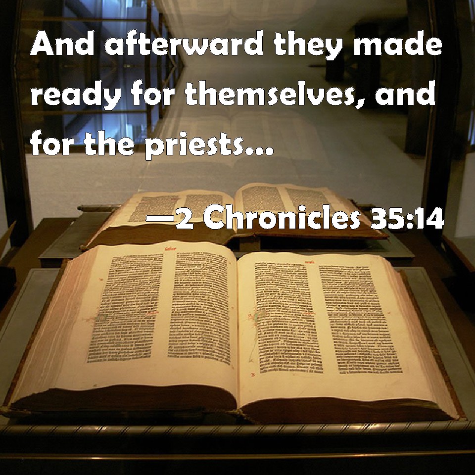 Choose a Background 2 Chronicles 35:14 And afterward they made ready for themselves, and for the priests: because the priests the sons of Aaron were busied in offering of burnt offerings and the fat until night; therefore the Levites prepared for themselves, and for the priests the sons of Aaron. KJV: And afterward they made ready for themselves, and for the priests: because the priests the sons of Aaron were busied in offering of burnt offerings and the fat until night; therefore the Levites prepared for themselves, and for the priests the sons of Aaron. DRB: And afterwards they made ready for themselves, and for the priests: for the priests were busied in offering of holocausts and the fat until night: wherefore the Levites prepared for themselves, and for the priests the sons of Aaron last. DBT: And afterwards they made ready for themselves and for the priests; because the priests, the sons of Aaron, were engaged in offering up the burnt-offerings and the fat until night; therefore the Levites prepared for themselves, and for the priests, the sons of Aaron. ERV: And afterward they prepared for themselves, and for the priests; because the priests the sons of Aaron were busied in offering the burnt offerings and the fat until night: therefore the Levites prepared for themselves, and for the priests the sons of Aaron. WBT: And afterwards they made ready for themselves, and for the priests: because the priests the sons of Aaron were busied in offering burnt-offerings and the fat until night; therefore the Levites prepared for themselves, and for the priests the sons of Aaron. WEB: Afterward they prepared for themselves, and for the priests, because the priests the sons of Aaron [were busied] in offering the burnt offerings and the fat until night: therefore the Levites prepared for themselves, and for the priests the sons of Aaron. YLT: And afterward they have prepared for themselves, and for the priests: for the priests, sons of Aaron, are in the offering up of the burnt-offering and of the fat till night; and the Levites have prepared for themselves, and for the priests, sons of Aaron.Links 2 Chronicles 35:14 NIV • 2 Chronicles 35:14 NLT • 2 Chronicles 35:14 ESV • 2 Chronicles 35:14 NASB • 2 Chronicles 35:14 KJV • 2 Chronicles 35:14 Interlinear • 2 Chronicles 35:14 Commentaries • 2 Chronicles 35:14 Parallel Texts • 2 Chronicles 35:14 Bible Apps • 2 Chronicles 35:14 Parallel • Bible Hub |