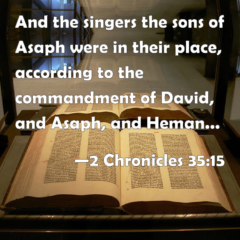 Choose a Background 2 Chronicles 35:15 And the singers the sons of Asaph were in their place, according to the commandment of David, and Asaph, and Heman, and Jeduthun the king's seer; and the porters waited at every gate; they might not depart from their service; for their brothers the Levites prepared for them. KJV: And the singers the sons of Asaph were in their place, according to the commandment of David, and Asaph, and Heman, and Jeduthun the king's seer; and the porters waited at every gate; they might not depart from their service; for their brethren the Levites prepared for them. DRB: And the singers the sons of Asaph stood in their order, according to the commandment of David, and Asaph, and Heman, and Idithun the prophets of the king: and the porters kept guard at every gate, so as not to depart one moment from their service: and therefore their brethren the Levites prepared meats for them. DBT: And the singers, the sons of Asaph, were in their place, according to the commandment of David, and Asaph, and Heman, and Jeduthun the king's seer; and the doorkeepers were at every gate; they had not to depart from their service, for their brethren the Levites prepared for them. ERV: And the singers the sons of Asaph were in their place, according to the commandment of David, and Asaph, and Heman, and Jeduthun the king's seer; and the porters were at every gate: they needed not to depart from their service, for their brethren the Levites prepared for them. WBT: And the singers the sons of Asaph were in their place, according to the commandment of David, and Asaph, and Heman, and Jeduthun the king's seer; and the porters waited at every gate; they might not depart from their service; for their brethren the Levites prepared for them. WEB: The singers the sons of Asaph were in their place, according to the commandment of David, and Asaph, and Heman, and Jeduthun the king's seer; and the porters were at every gate: they didn't need to depart from their service; for their brothers the Levites prepared for them. YLT: And the singers, sons of Asaph, are on their station, according to the command of David, and Asaph, and Heman, and Jeduthun seer of the king, and the gate keepers are at gate and gate; it is not for them to turn aside from off their service, for their brethren the Levites have prepared for them.Links 2 Chronicles 35:15 NIV • 2 Chronicles 35:15 NLT • 2 Chronicles 35:15 ESV • 2 Chronicles 35:15 NASB • 2 Chronicles 35:15 KJV • 2 Chronicles 35:15 Interlinear • 2 Chronicles 35:15 Commentaries • 2 Chronicles 35:15 Parallel Texts • 2 Chronicles 35:15 Bible Apps • 2 Chronicles 35:15 Parallel • Bible Hub |
