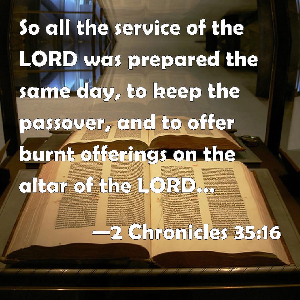 Choose a Background 2 Chronicles 35:16 So all the service of the LORD was prepared the same day, to keep the passover, and to offer burnt offerings on the altar of the LORD, according to the commandment of king Josiah. KJV: So all the service of the LORD was prepared the same day, to keep the passover, and to offer burnt offerings upon the altar of the LORD, according to the commandment of king Josiah. DRB: So all the service of the Lord was duly accomplished that day, both in keeping the phase, and offering holocausts upon the altar of the Lord, according to the commandment of king Josias. DBT: And all the service of Jehovah was prepared the same day, to hold the passover, and to offer burnt-offerings on the altar of Jehovah according to the commandment of king Josiah. ERV: So all the service of the LORD was prepared the same day, to keep the passover, and to offer burnt offerings upon the altar of the LORD, according to the commandment of king Josiah. WBT: So all the service of the LORD was prepared the same day, to keep the passover, and to offer burnt-offerings upon the altar of the LORD, according to the commandment of king Josiah. WEB: So all the service of Yahweh was prepared the same day, to keep the Passover, and to offer burnt offerings on the altar of Yahweh, according to the commandment of king Josiah. YLT: And all the service of Jehovah is prepared on that day, to keep the passover, and to cause to ascend burnt-offering upon the altar of Jehovah, according to the command of king Josiah.Links 2 Chronicles 35:16 NIV • 2 Chronicles 35:16 NLT • 2 Chronicles 35:16 ESV • 2 Chronicles 35:16 NASB • 2 Chronicles 35:16 KJV • 2 Chronicles 35:16 Interlinear • 2 Chronicles 35:16 Commentaries • 2 Chronicles 35:16 Parallel Texts • 2 Chronicles 35:16 Bible Apps • 2 Chronicles 35:16 Parallel • Bible Hub |