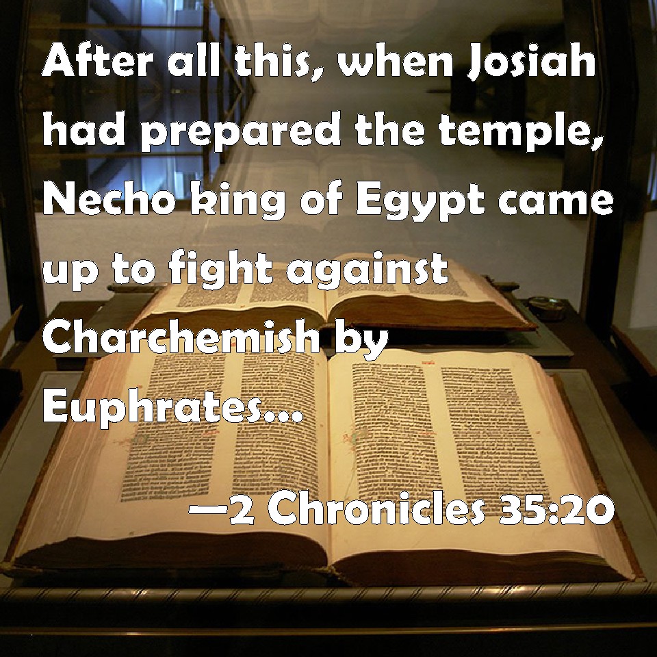 Choose a Background 2 Chronicles 35:20 After all this, when Josiah had prepared the temple, Necho king of Egypt came up to fight against Charchemish by Euphrates: and Josiah went out against him. KJV: After all this, when Josiah had prepared the temple, Necho king of Egypt came up to fight against Carchemish by Euphrates: and Josiah went out against him. DRB: After that Josias had repaired the temple, Nechao king of Egypt came up to fight in Charcamis by the Euphrates: and Josias went out to meet him. DBT: After all this, when Josiah had arranged the house, Necho king of Egypt came up to fight against Karkemish at the Euphrates; and Josiah went out against him. ERV: After all this, when Josiah had prepared the temple, Neco king of Egypt went up to fight against Carchemish by Euphrates: and Josiah went out against him. WBT: After all this, when Josiah had prepared the temple, Necho king of Egypt came up to fight against Charchemish by Euphrates: and Josiah went out against him. WEB: After all this, when Josiah had prepared the temple, Neco king of Egypt went up to fight against Carchemish by the Euphrates: and Josiah went out against him. YLT: After all this, when Josiah hath prepared the house, come up hath Necho king of Egypt, to fight against Carchemish by Phrat, and Josiah goeth forth to meet him;Links 2 Chronicles 35:20 NIV • 2 Chronicles 35:20 NLT • 2 Chronicles 35:20 ESV • 2 Chronicles 35:20 NASB • 2 Chronicles 35:20 KJV • 2 Chronicles 35:20 Interlinear • 2 Chronicles 35:20 Commentaries • 2 Chronicles 35:20 Parallel Texts • 2 Chronicles 35:20 Bible Apps • 2 Chronicles 35:20 Parallel • Bible Hub |