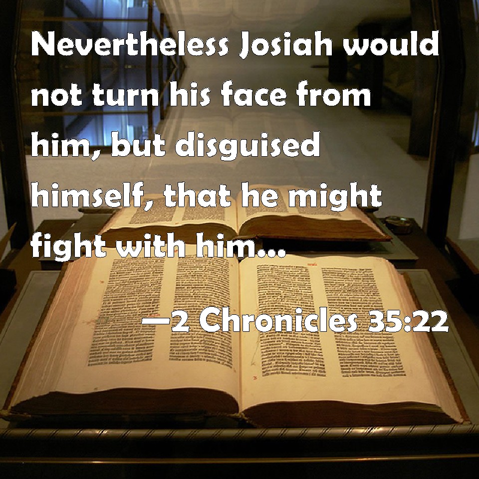 Choose a Background 2 Chronicles 35:22 Nevertheless Josiah would not turn his face from him, but disguised himself, that he might fight with him, and listened not to the words of Necho from the mouth of God, and came to fight in the valley of Megiddo. KJV: Nevertheless Josiah would not turn his face from him, but disguised himself, that he might fight with him, and hearkened not unto the words of Necho from the mouth of God, and came to fight in the valley of Megiddo. DRB: Josias would not return, but prepared to fight against him, and hearkened not to the words of Nechao from the mouth of God, but went to fight in the field of Mageddo. DBT: But Josiah would not turn his face from him, but disguised himself, that he might fight against him; and he hearkened not to the words of Necho from the mouth of God; and he came to fight in the valley of Megiddo. ERV: Nevertheless Josiah would not turn his face from him, but disguised himself, that he might fight with him, and hearkened not unto the words of Neco, from the month of God, and came to fight in the valley of Megiddo. WBT: Nevertheless Josiah would not turn his face from him, but disguised himself that he might fight with him, and hearkened not to the words of Necho from the mouth of God, and came to fight in the valley of Megiddo. WEB: Nevertheless Josiah would not turn his face from him, but disguised himself, that he might fight with him, and didn't listen to the words of Neco from the mouth of God, and came to fight in the valley of Megiddo. YLT: And Josiah hath not turned round his face from him, but to fight against him hath disguised himself, and hath not hearkened unto the words of Necho, from the mouth of God, and cometh in to fight in the valley of Megiddo;Links 2 Chronicles 35:22 NIV • 2 Chronicles 35:22 NLT • 2 Chronicles 35:22 ESV • 2 Chronicles 35:22 NASB • 2 Chronicles 35:22 KJV • 2 Chronicles 35:22 Interlinear • 2 Chronicles 35:22 Commentaries • 2 Chronicles 35:22 Parallel Texts • 2 Chronicles 35:22 Bible Apps • 2 Chronicles 35:22 Parallel • Bible Hub |