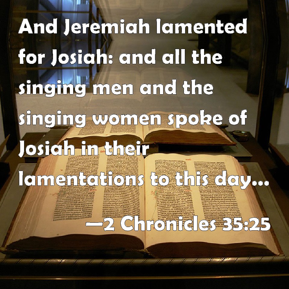 Choose a Background 2 Chronicles 35:25 And Jeremiah lamented for Josiah: and all the singing men and the singing women spoke of Josiah in their lamentations to this day, and made them an ordinance in Israel: and, behold, they are written in the lamentations. KJV: And Jeremiah lamented for Josiah: and all the singing men and the singing women spake of Josiah in their lamentations to this day, and made them an ordinance in Israel: and, behold, they are written in the lamentations. DRB: Particularly Jeremias: whose lamentations for Josias all the singing men and singing women repeat unto this day, and it became like a law in Israel: Behold it is found written in the Lamentations. DBT: And Jeremiah lamented for Josiah; and all the singing men and singing women spoke of Josiah in their lamentations to this day; and they made them an ordinance for Israel. And behold, they are written in the lamentations. ERV: And Jeremiah lamented for Josiah: and all the singing men and singing women spake of Josiah in their lamentations, unto this day; and they made them an ordinance in Israel: and, behold, they are written in the lamentations. WBT: And Jeremiah lamented for Josiah: and all the singing men and the singing women have spoken of Josiah in their lamentations to this day, and made them an ordinance in Israel: and behold, they are written in the lamentations. WEB: Jeremiah lamented for Josiah: and all the singing men and singing women spoke of Josiah in their lamentations to this day; and they made them an ordinance in Israel: and behold, they are written in the lamentations. YLT: and Jeremiah lamenteth for Josiah, and all the singers and the songstresses speak in their lamentations of Josiah unto this day, and set them for a statute on Israel, and lo, they are written beside the lamentations.Links 2 Chronicles 35:25 NIV • 2 Chronicles 35:25 NLT • 2 Chronicles 35:25 ESV • 2 Chronicles 35:25 NASB • 2 Chronicles 35:25 KJV • 2 Chronicles 35:25 Interlinear • 2 Chronicles 35:25 Commentaries • 2 Chronicles 35:25 Parallel Texts • 2 Chronicles 35:25 Bible Apps • 2 Chronicles 35:25 Parallel • Bible Hub |