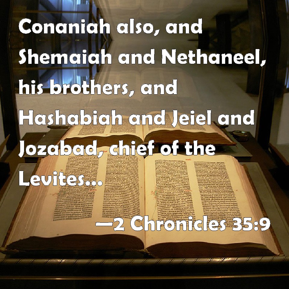 Choose a Background 2 Chronicles 35:9 Conaniah also, and Shemaiah and Nethaneel, his brothers, and Hashabiah and Jeiel and Jozabad, chief of the Levites, gave to the Levites for passover offerings five thousand small cattle, and five hundred oxen. KJV: Conaniah also, and Shemaiah and Nethaneel, his brethren, and Hashabiah and Jeiel and Jozabad, chief of the Levites, gave unto the Levites for passover offerings five thousand small cattle, and five hundred oxen. DRB: And Chonenias, and Semeias and Nathanael, his brethren, and Hasabias, and Jehiel, and Jozabad princes of the Levites, gave to the rest of the Levites to celebrate the phase five thousand small cattle, and five hundred oxen. DBT: and Conaniah, and Shemaiah and Nethaneel, his brethren, and Hashabiah and Jeiel and Jozabad, chief of the Levites, gave as heave-offering to the Levites for the passover-offerings five thousand small cattle and five hundred oxen. ERV: Conaniah also, and Shemaiah and Nethanel, his brethren, and Hashabiah and Jeiel and Jozabad, the chiefs of the Levites, gave unto the Levites for the passover offerings five thousand small cattle, and five hundred oxen. WBT: Conaniah also, and Shemaiah, and Nethaneel, his brethren, and Hashabiah and Jehiel and Jozabad, chief of the Levites, gave to the Levites for passover-offerings five thousand small cattle, and five hundred oxen. WEB: Conaniah also, and Shemaiah and Nethanel, his brothers, and Hashabiah and Jeiel and Jozabad, the chiefs of the Levites, gave to the Levites for the Passover offerings five thousand [small livestock], and five hundred head of cattle. YLT: and Conaniah, and Shemaiah, and Nethaneel, his brethren, and Hashabiah, and Jeiel, and Jozabad, heads of the Levites, have lifted up to the Levites, for passover-offerings, five thousand, and oxen five hundred.Links 2 Chronicles 35:9 NIV • 2 Chronicles 35:9 NLT • 2 Chronicles 35:9 ESV • 2 Chronicles 35:9 NASB • 2 Chronicles 35:9 KJV • 2 Chronicles 35:9 Interlinear • 2 Chronicles 35:9 Commentaries • 2 Chronicles 35:9 Parallel Texts • 2 Chronicles 35:9 Bible Apps • 2 Chronicles 35:9 Parallel • Bible Hub |