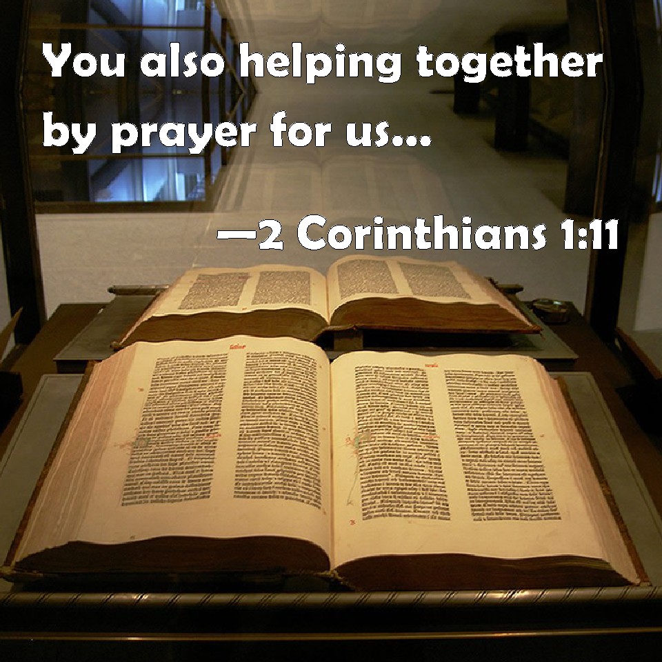 Choose a Background 2 Corinthians 1:11 You also helping together by prayer for us, that for the gift bestowed on us by the means of many persons thanks may be given by many on our behalf. KJV: Ye also helping together by prayer for us, that for the gift bestowed upon us by the means of many persons thanks may be given by many on our behalf. DRB: You helping withal in prayer for us: that for this gift obtained for us, by the means of many persons, thanks may be given by many in our behalf. DBT: ye also labouring together by supplication for us that the gift towards us, through means of many persons, may be the subject of the thanksgiving of many for us. ERV: ye also helping together on our behalf by your supplication; that, for the gift bestowed upon us by means of many, thanks may be given by many persons on our behalf. WBT: Ye also helping together by prayer for us, that for the gift bestowed upon us by the means of many persons, thanks may be given by many on our behalf. WEB: you also helping together on our behalf by your supplication; that, for the gift bestowed on us by means of many, thanks may be given by many persons on your behalf. YLT: ye working together also for us by your supplication, that the gift through many persons to us, through many may be thankfully acknowledged for us.Links 2 Corinthians 1:11 NIV • 2 Corinthians 1:11 NLT • 2 Corinthians 1:11 ESV • 2 Corinthians 1:11 NASB • 2 Corinthians 1:11 KJV • 2 Corinthians 1:11 Interlinear • 2 Corinthians 1:11 Commentaries • 2 Corinthians 1:11 Parallel Texts • 2 Corinthians 1:11 Bible Apps • 2 Corinthians 1:11 Parallel • Bible Hub |