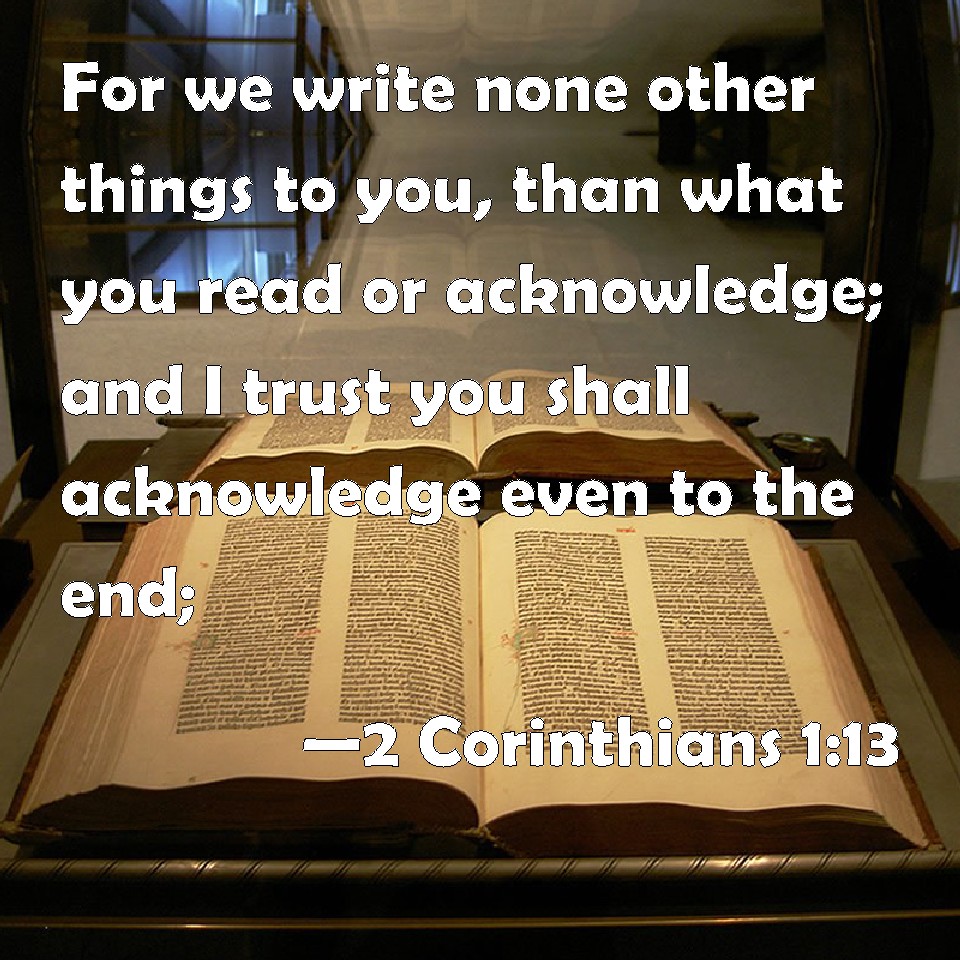 Choose a Background 2 Corinthians 1:13 For we write none other things to you, than what you read or acknowledge; and I trust you shall acknowledge even to the end; KJV: For we write none other things unto you, than what ye read or acknowledge; and I trust ye shall acknowledge even to the end; DRB: For we write no other things to you than what you have read and known. And I hope that you shall know unto the end: DBT: For we do not write other things to you but what ye well know and recognise; and I hope that ye will recognise to the end, ERV: For we write none other things unto you, than what ye read or even acknowledge, and I hope ye will acknowledge unto the end: WBT: For we write no other things to you, than what ye read or acknowledge; and I trust ye will acknowledge even to the end; WEB: For we write no other things to you, than what you read or even acknowledge, and I hope you will acknowledge to the end; YLT: for no other things do we write to you, but what ye either do read or also acknowledge, and I hope that also unto the end ye shall acknowledge,Links 2 Corinthians 1:13 NIV • 2 Corinthians 1:13 NLT • 2 Corinthians 1:13 ESV • 2 Corinthians 1:13 NASB • 2 Corinthians 1:13 KJV • 2 Corinthians 1:13 Interlinear • 2 Corinthians 1:13 Commentaries • 2 Corinthians 1:13 Parallel Texts • 2 Corinthians 1:13 Bible Apps • 2 Corinthians 1:13 Parallel • Bible Hub |