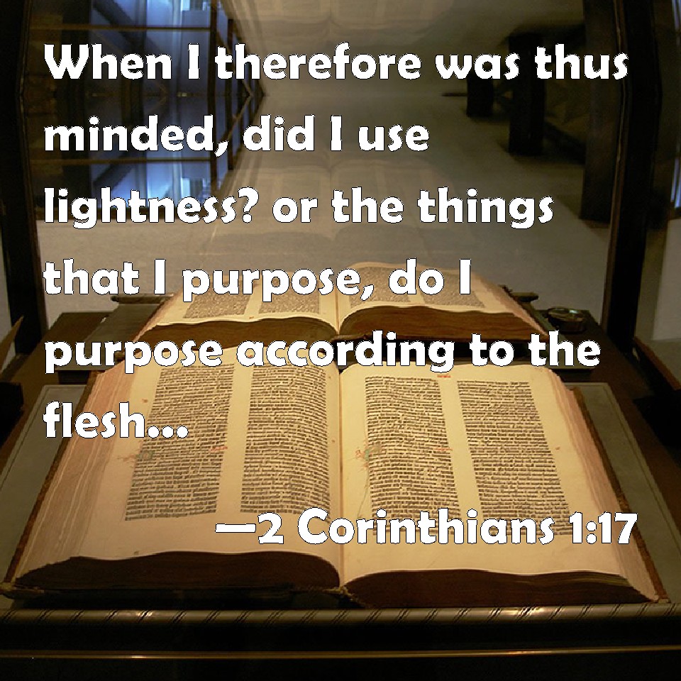 Choose a Background 2 Corinthians 1:17 When I therefore was thus minded, did I use lightness? or the things that I purpose, do I purpose according to the flesh, that with me there should be yes yes, and no no? KJV: When I therefore was thus minded, did I use lightness? or the things that I purpose, do I purpose according to the flesh, that with me there should be yea yea, and nay nay? DRB: Whereas then I was thus minded, did I use lightness? Or, the things that I purpose, do I purpose according to the flesh, that there should be with me, It is, and It is not? DBT: Having therefore this purpose, did I then use lightness? Or what I purpose, do I purpose according to flesh, that there should be with me yea yea, and nay nay? ERV: When I therefore was thus minded, did I shew fickleness? or the things that I purpose, do I purpose according to the flesh, that with me there should be the yea yea and the nay nay? WBT: When I therefore was thus minded, did I use levity? or the things that I purpose, do I purpose according to the flesh, that with me there should be yea, yea, and nay, nay? WEB: When I therefore was thus determined, did I show fickleness? Or the things that I purpose, do I purpose according to the flesh, that with me there should be the "Yes, yes" and the "No, no?" YLT: This, therefore, counselling, did I then use the lightness; or the things that I counsel, according to the flesh do I counsel, that it may be with me Yes, yes, and No, no?Links 2 Corinthians 1:17 NIV • 2 Corinthians 1:17 NLT • 2 Corinthians 1:17 ESV • 2 Corinthians 1:17 NASB • 2 Corinthians 1:17 KJV • 2 Corinthians 1:17 Interlinear • 2 Corinthians 1:17 Commentaries • 2 Corinthians 1:17 Parallel Texts • 2 Corinthians 1:17 Bible Apps • 2 Corinthians 1:17 Parallel • Bible Hub |
