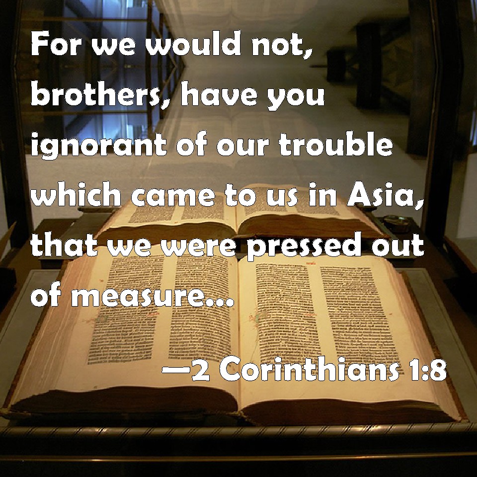 Choose a Background 2 Corinthians 1:8 For we would not, brothers, have you ignorant of our trouble which came to us in Asia, that we were pressed out of measure, above strength, so that we despaired even of life: KJV: For we would not, brethren, have you ignorant of our trouble which came to us in Asia, that we were pressed out of measure, above strength, insomuch that we despaired even of life: DRB: For we would not have you ignorant,brethren, of our tribulation, which came to us in Asia, that we were pressed out of measure above our strength, so that we were weary even of life. DBT: For we do not wish you to be ignorant, brethren, as to our tribulation which happened to us in Asia, that we were excessively pressed beyond our power, so as to despair even of living. ERV: For we would not have you ignorant, brethren, concerning our affliction which befell us in Asia, that we were weighed down exceedingly, beyond our power, insomuch that we despaired even of life: WBT: For we would not, brethren, have you ignorant of our trouble which came to us in Asia, that we were pressed out of measure, above strength, so that we despaired even of life: WEB: For we don't desire to have you uninformed, brothers, concerning our affliction which happened to us in Asia, that we were weighed down exceedingly, beyond our power, so much that we despaired even of life. YLT: For we do not wish you to be ignorant, brethren, of our tribulation that happened to us in Asia, that we were exceedingly burdened above our power, so that we despaired even of life;Links 2 Corinthians 1:8 NIV • 2 Corinthians 1:8 NLT • 2 Corinthians 1:8 ESV • 2 Corinthians 1:8 NASB • 2 Corinthians 1:8 KJV • 2 Corinthians 1:8 Interlinear • 2 Corinthians 1:8 Commentaries • 2 Corinthians 1:8 Parallel Texts • 2 Corinthians 1:8 Bible Apps • 2 Corinthians 1:8 Parallel • Bible Hub |