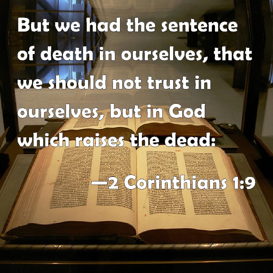 Choose a Background 2 Corinthians 1:9 But we had the sentence of death in ourselves, that we should not trust in ourselves, but in God which raises the dead: KJV: But we had the sentence of death in ourselves, that we should not trust in ourselves, but in God which raiseth the dead: DRB: But we had in ourselves the answer of death, that we should not trust in ourselves, but in God who raiseth the dead. DBT: But we ourselves had the sentence of death in ourselves, that we should not have our trust in ourselves, but in God who raises the dead; ERV: yea, we ourselves have had the answer of death within ourselves, that we should not trust in ourselves, but in God which raiseth the dead: WBT: But we had the sentence of death in ourselves, that we should not trust in ourselves, but in God who raiseth the dead: WEB: Yes, we ourselves have had the sentence of death within ourselves, that we should not trust in ourselves, but in God who raises the dead, YLT: but we ourselves in ourselves the sentence of the death have had, that we may not be trusting on ourselves, but on God, who is raising the dead,Links 2 Corinthians 1:9 NIV • 2 Corinthians 1:9 NLT • 2 Corinthians 1:9 ESV • 2 Corinthians 1:9 NASB • 2 Corinthians 1:9 KJV • 2 Corinthians 1:9 Interlinear • 2 Corinthians 1:9 Commentaries • 2 Corinthians 1:9 Parallel Texts • 2 Corinthians 1:9 Bible Apps • 2 Corinthians 1:9 Parallel • Bible Hub |