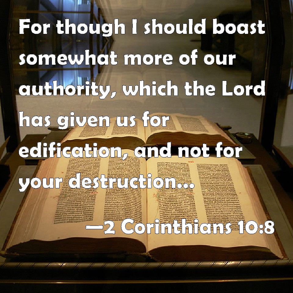 Choose a Background 2 Corinthians 10:8 For though I should boast somewhat more of our authority, which the Lord has given us for edification, and not for your destruction, I should not be ashamed: KJV: For though I should boast somewhat more of our authority, which the Lord hath given us for edification, and not for your destruction, I should not be ashamed: DRB: For if also I should boast somewhat more of our power, which the Lord hath given us unto edification, and not for your destruction, I should not be ashamed. DBT: For and if I should boast even somewhat more abundantly of our authority, which the Lord has given to us for building up and not for your overthrowing, I shall not be put to shame; ERV: For though I should glory somewhat abundantly concerning our authority (which the Lord gave for building you up, and not for casting you down), I shall not be put to shame: WBT: For though I should boast somewhat more of our authority, which the Lord hath given us for edification, and not for your destruction, I should not be ashamed: WEB: For though I should boast somewhat abundantly concerning our authority, (which the Lord gave for building you up, and not for casting you down) I will not be disappointed, YLT: for even if also anything more abundantly I shall boast concerning our authority, that the Lord gave us for building up, and not for casting you down, I shall not be ashamed;Links 2 Corinthians 10:8 NIV • 2 Corinthians 10:8 NLT • 2 Corinthians 10:8 ESV • 2 Corinthians 10:8 NASB • 2 Corinthians 10:8 KJV • 2 Corinthians 10:8 Interlinear • 2 Corinthians 10:8 Commentaries • 2 Corinthians 10:8 Parallel Texts • 2 Corinthians 10:8 Bible Apps • 2 Corinthians 10:8 Parallel • Bible Hub |